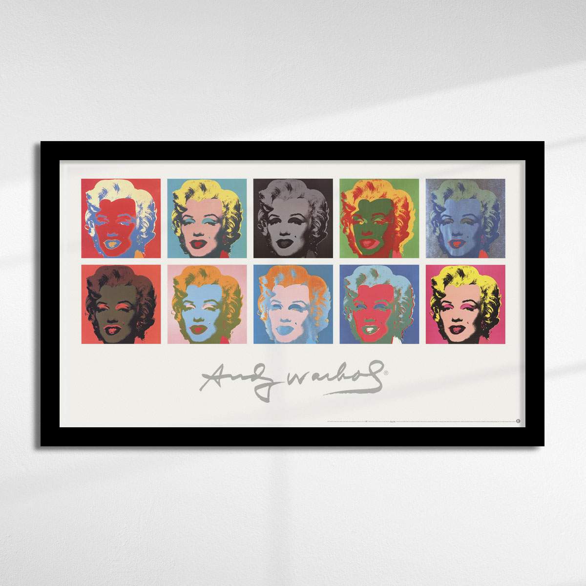 About this piece: This grouping of all ten Marilyn’s in a magnificent limited edition poster was published by Achenbach Editions with special ties to the Andy Warhol Foundation. The poster features images of all 10 Marilyn Monroe portraits, reproduced with the highest resolution and truest to the original colours used by Andy Warhol. Printed on heavy stock paper. Beneath the images, a large printed signature of the artist adds a further authentic touch and the poster’s connection to Warhol’s artistic legacy. Framed in black. Certificate of Provenance included.