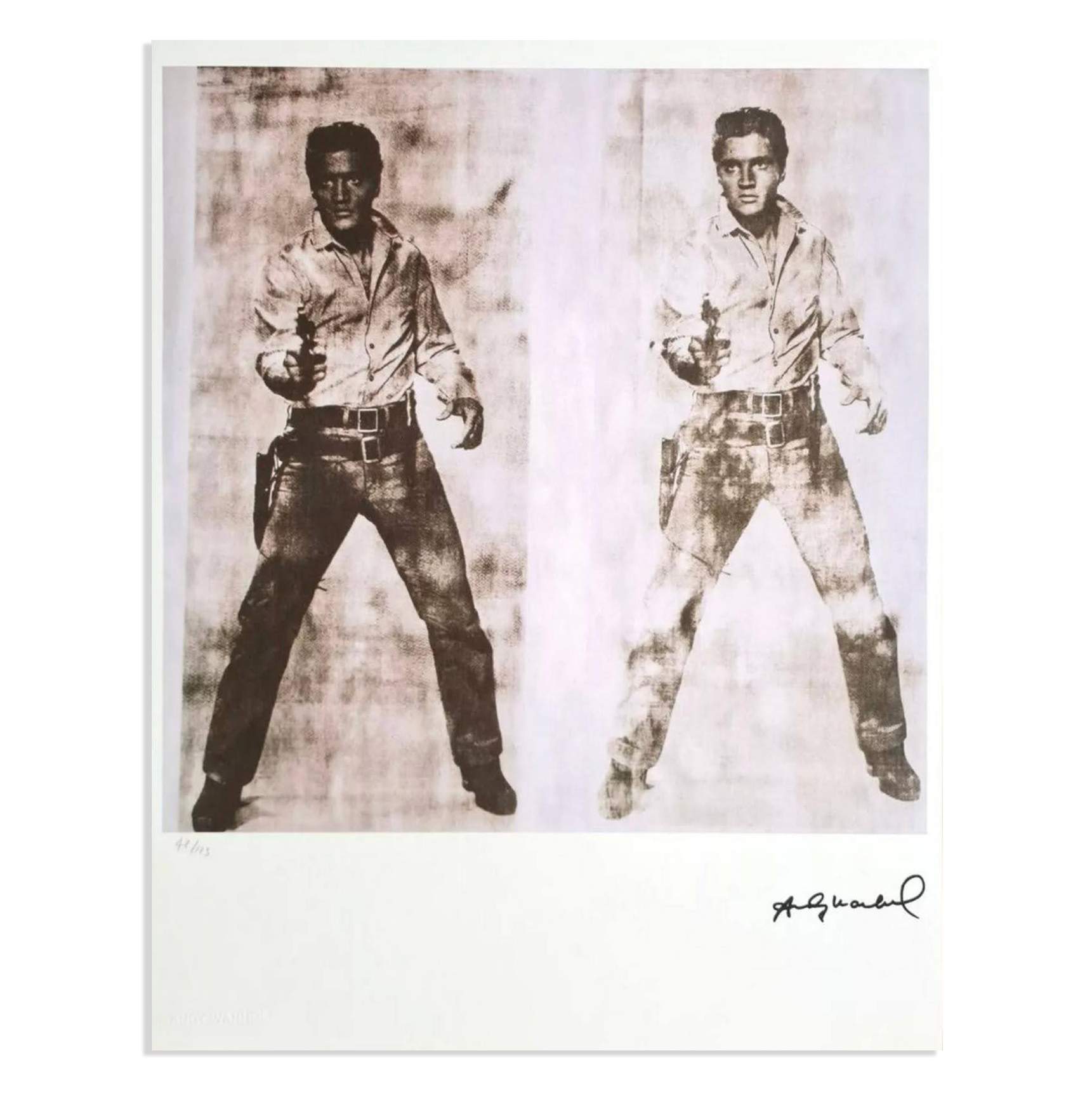 About this piece: Elvis by Andy Warhol. Colour proof on Arches paper, signed in plate, and stamp of the publisher Leo Castelli, New York. Numbered on 100 copies. A certificate from the publisher accompanies the work. Framed with AR70 glass (non-reflective and 70% UV protection).