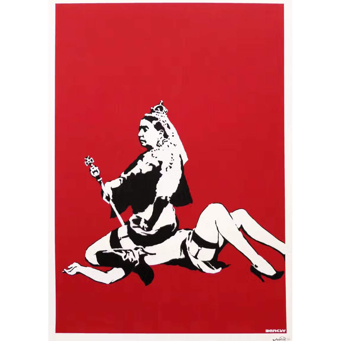 About this piece: “Queen Vic” by Banksy (unsigned edition) is an early and provocative print released by Pictures on Walls, with only 50 signed pieces and 500 unsigned works. This artwork, one of Banksy’s most controversial, depicts Queen Victoria in full ceremonial regalia, sitting on the face of a woman dressed in stockings and suspenders. The red background contrasts sharply with the black and white stencil outlines, creating a striking visual impact.