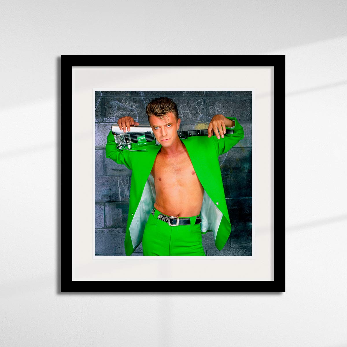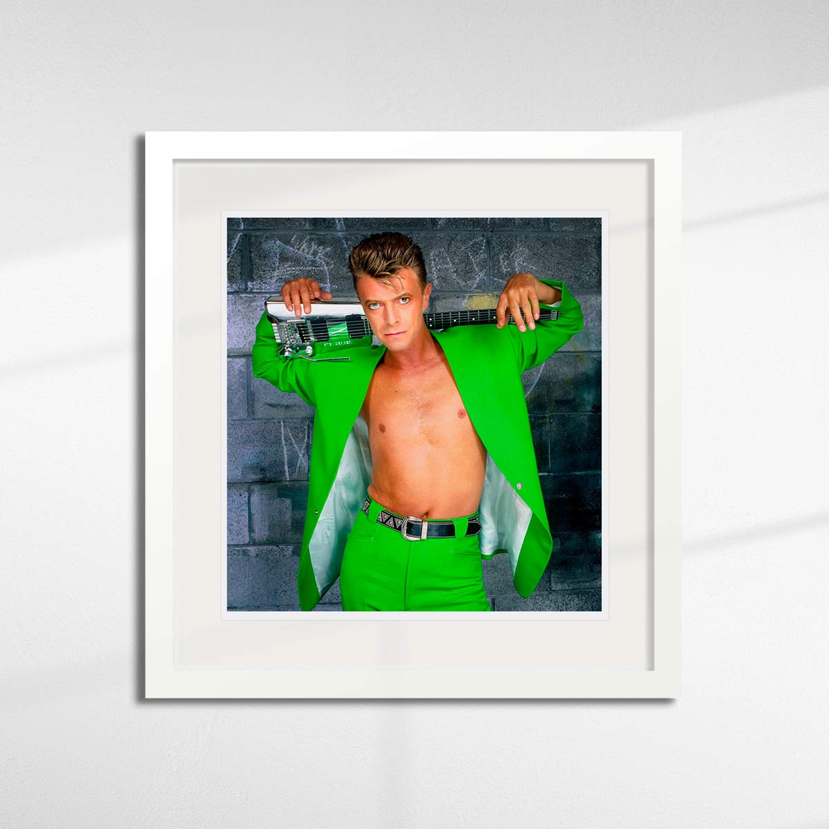 About this piece: Limited edition photographic print of David Bowie wearing a green Thierry Mugler suit with his chrome Steinberger guitar resting across his shoulders. Photographed in 1991 by Brian Aris.