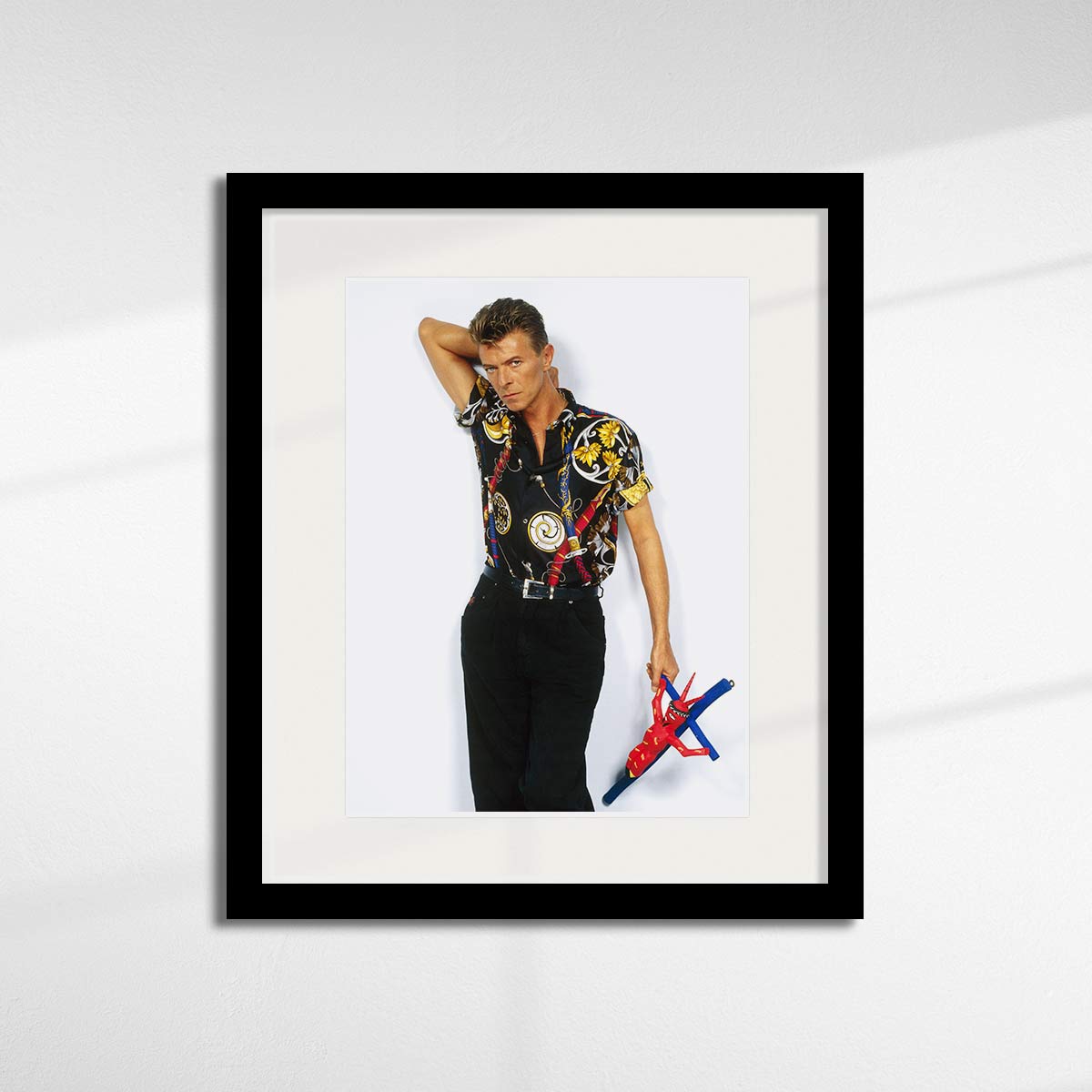 About this piece: Studio portrait of David Bowie wearing a Versace shirt holding a crucifix with a red devil. Photographed by Brian Aris.