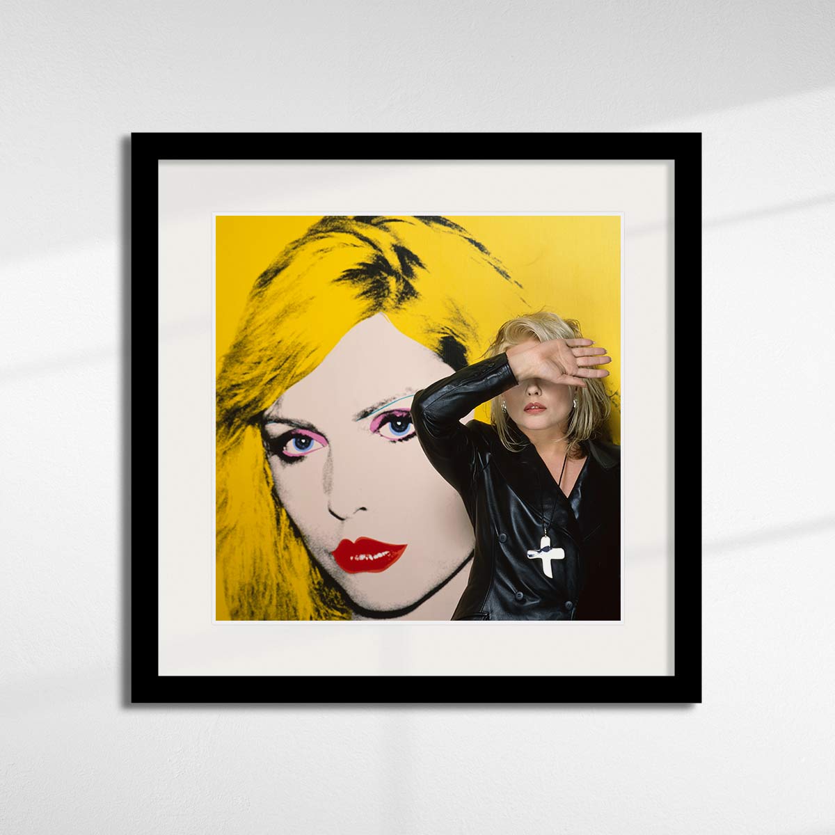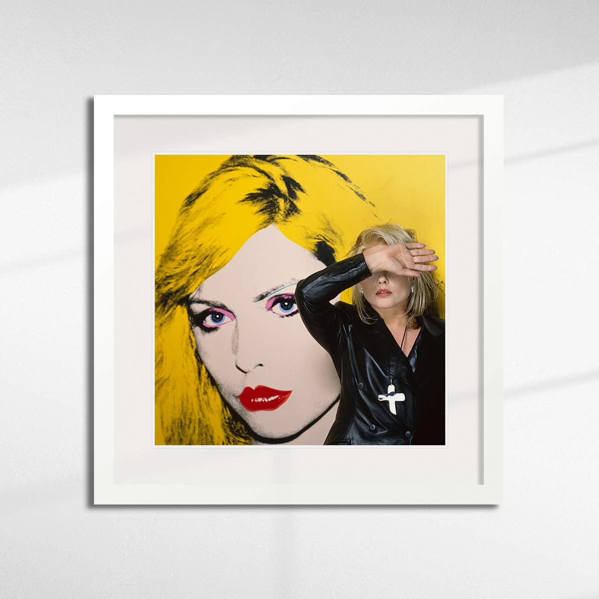 About this piece: Blondie lead singer, Debbie Harry poses with her hand covering her face in front of her own portrait by Andy Warhol. Photographed by Brian Aris in 1988.