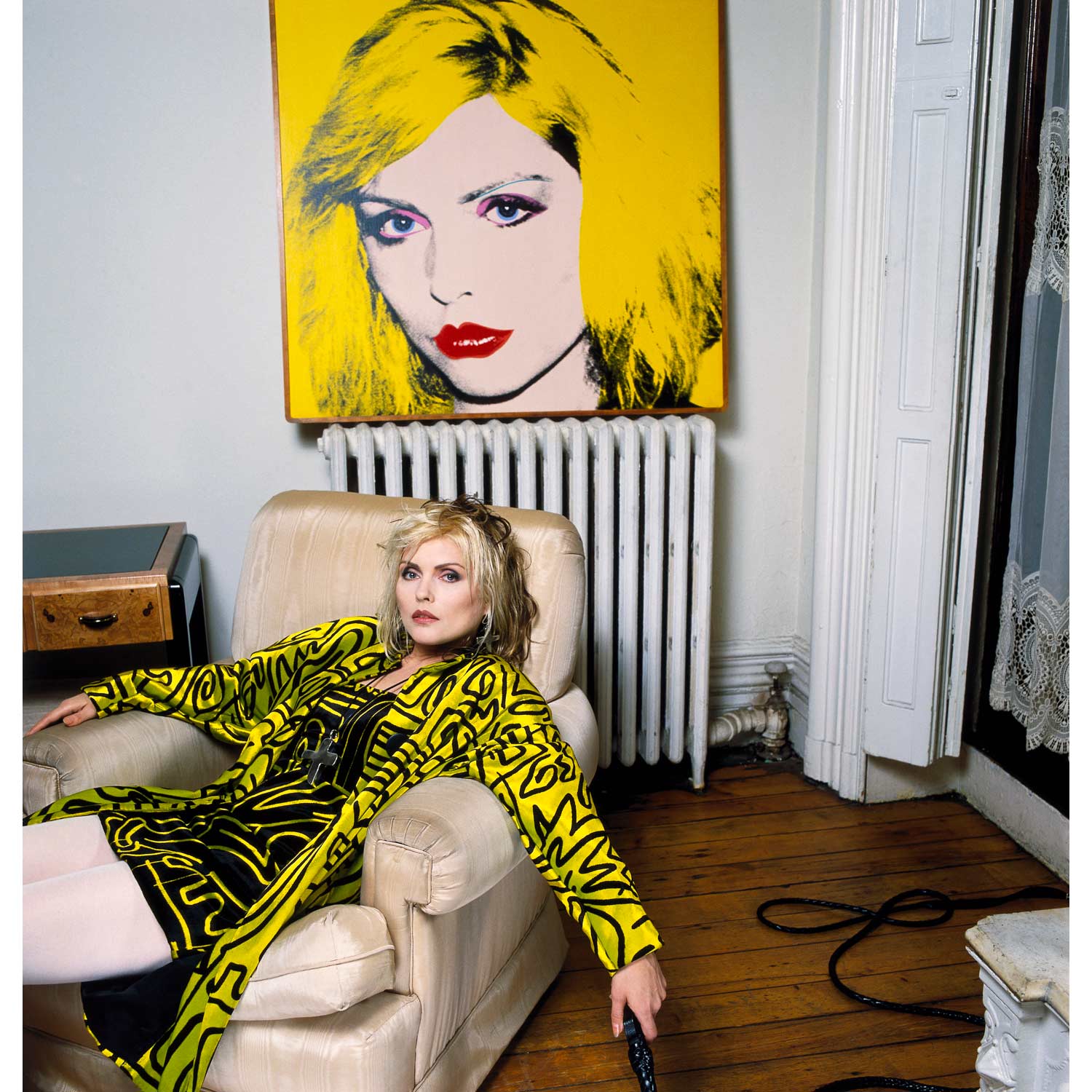 About this piece: Blondie lead singer, Debbie Harry poses in her New York apartment with her portrait by Andy Warhol resting on the radiator in the background. Photographed by Brian Aris in 1988.