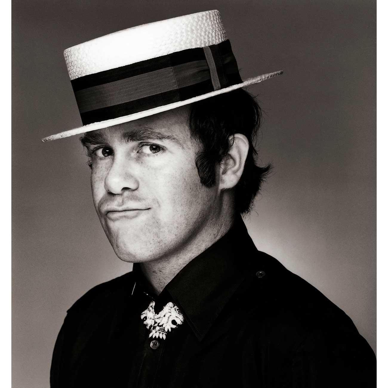 About this piece: Multiple Grammy-winning legend and flamboyant superstar, Elton is the most enduringly successful singer/songwriter of his generation. Photographed in 1980 sporting a dapper straw boater hat and playful expression.