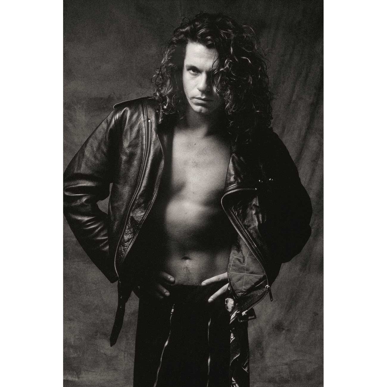 About this piece: Limited edition photographic print of Michael Hutchence in black and white. Photographed by Brian Aris. The Australian singer, songwriter, and actor was the co-founder, lead singer, and lyricist of the rock band INXS from 1977 until his death in 1997. The band sold over 50 million records worldwide and was inducted into the ARIA Hall of Fame in 2001.