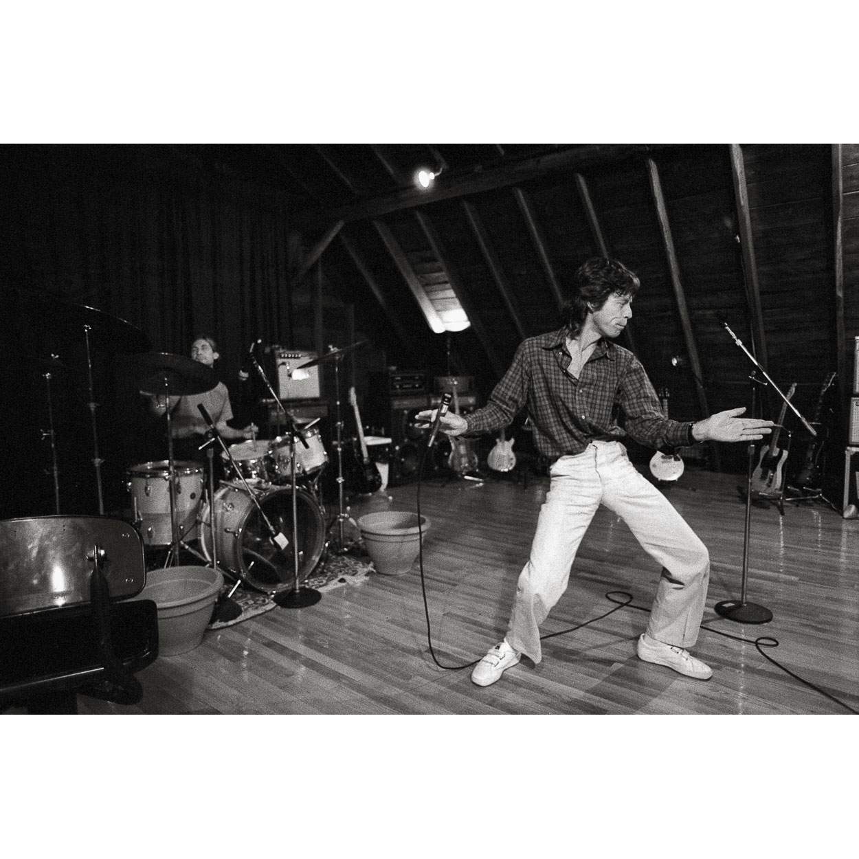About this piece: Limited edition black and white photographic print of The Rolling Stones front man, Mick Jagger rehearsing in Boston, USA. Photographed by Brian Aris in 1981.