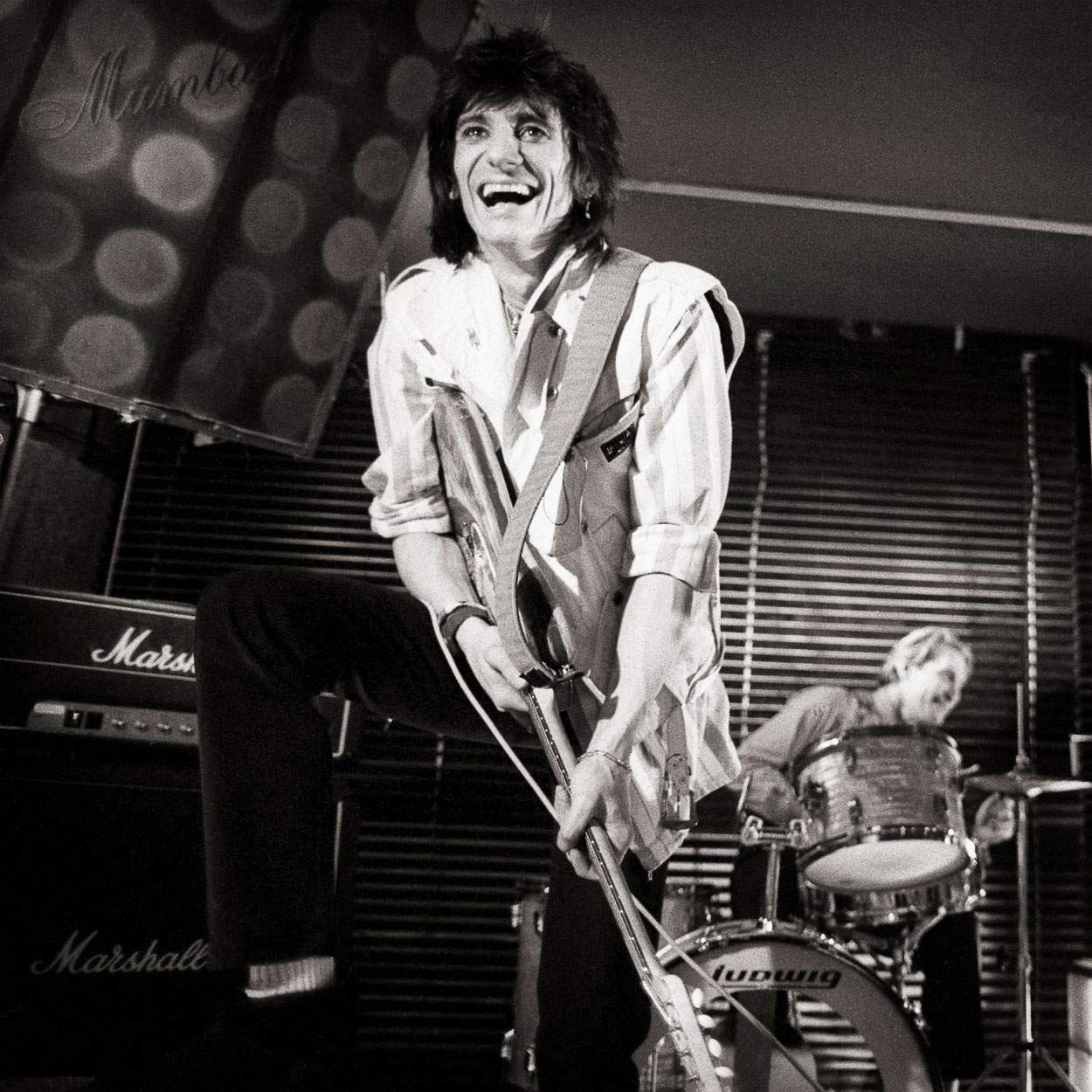 About this piece: Limited edition black and white photographic print of Rolling Stones guitarist, Ronnie Wood playing his guitar in Paris, 1983. Photographed by Brian Aris.