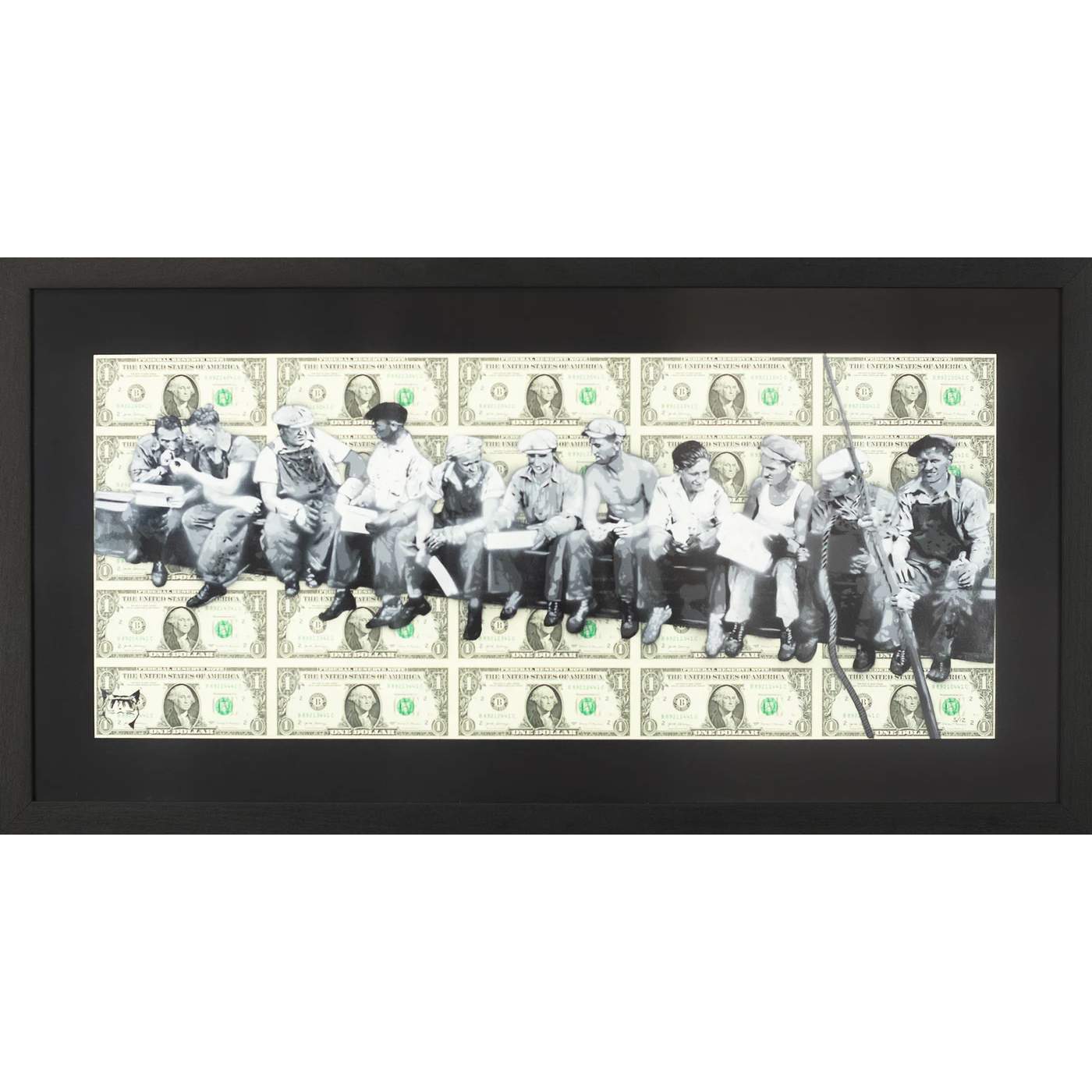 About this piece: Spray paint on US mint uncut sheet of authentic dollar bills.
