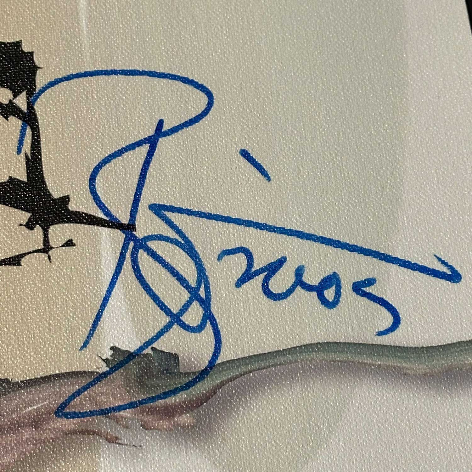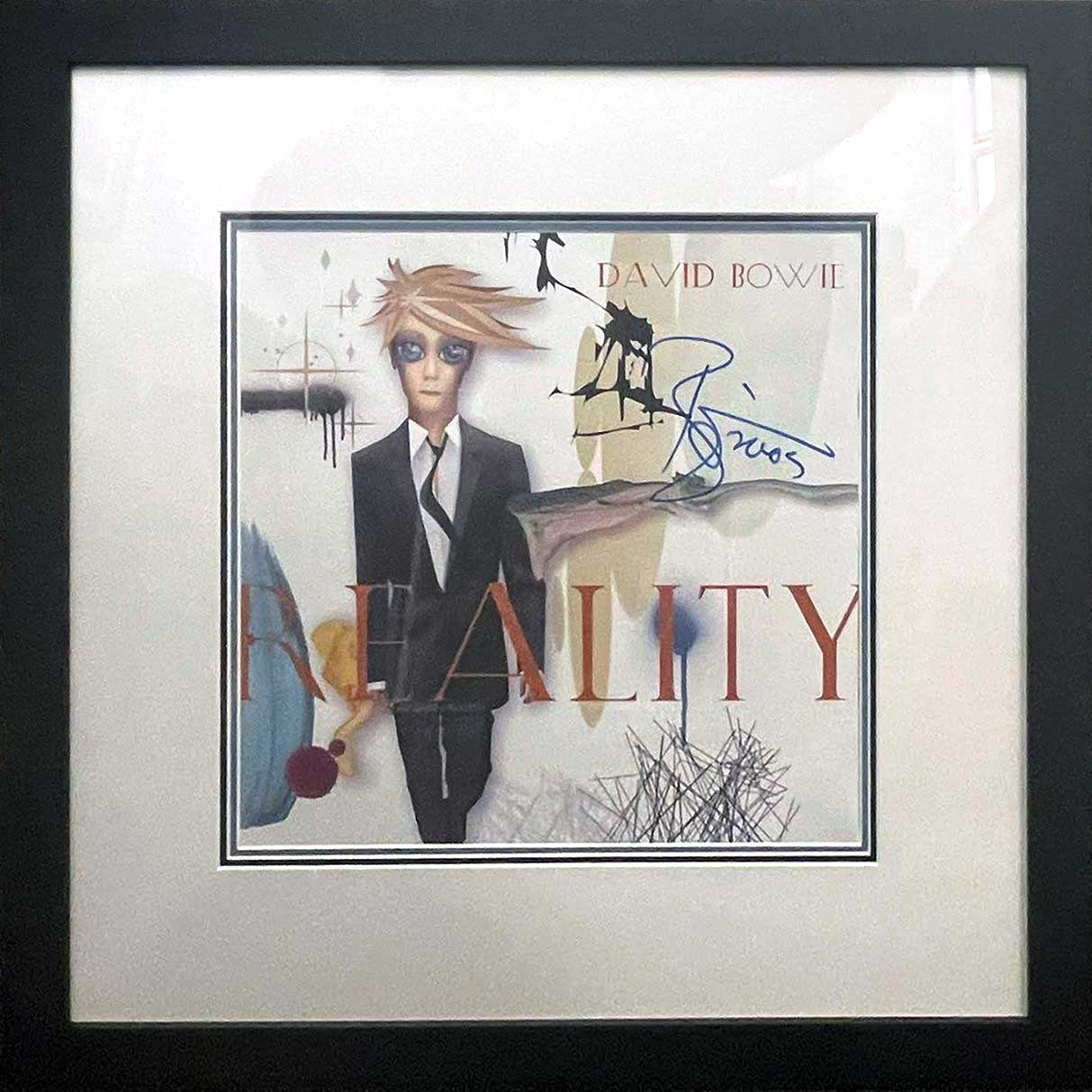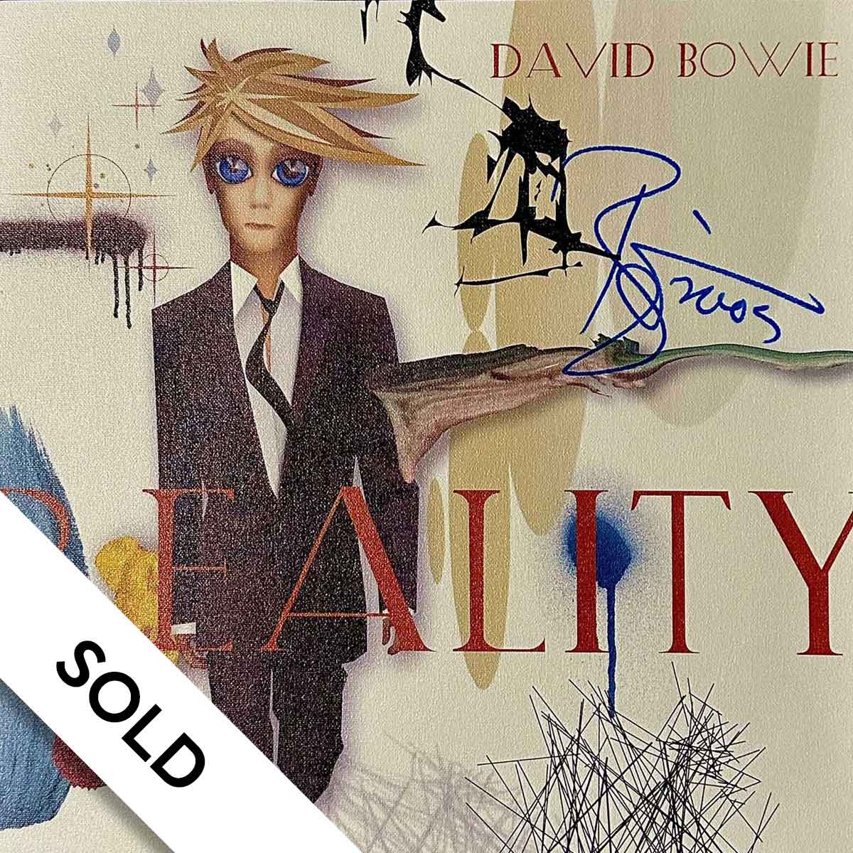About this piece: David Bowie – Rare Reality Promo Canvas. Hand signed by Bowie in 2005. Only 10 were signed! The artwork is designed by Jonathan Barnbrook in collaboration with graphic artist Rex Ray. Framed.