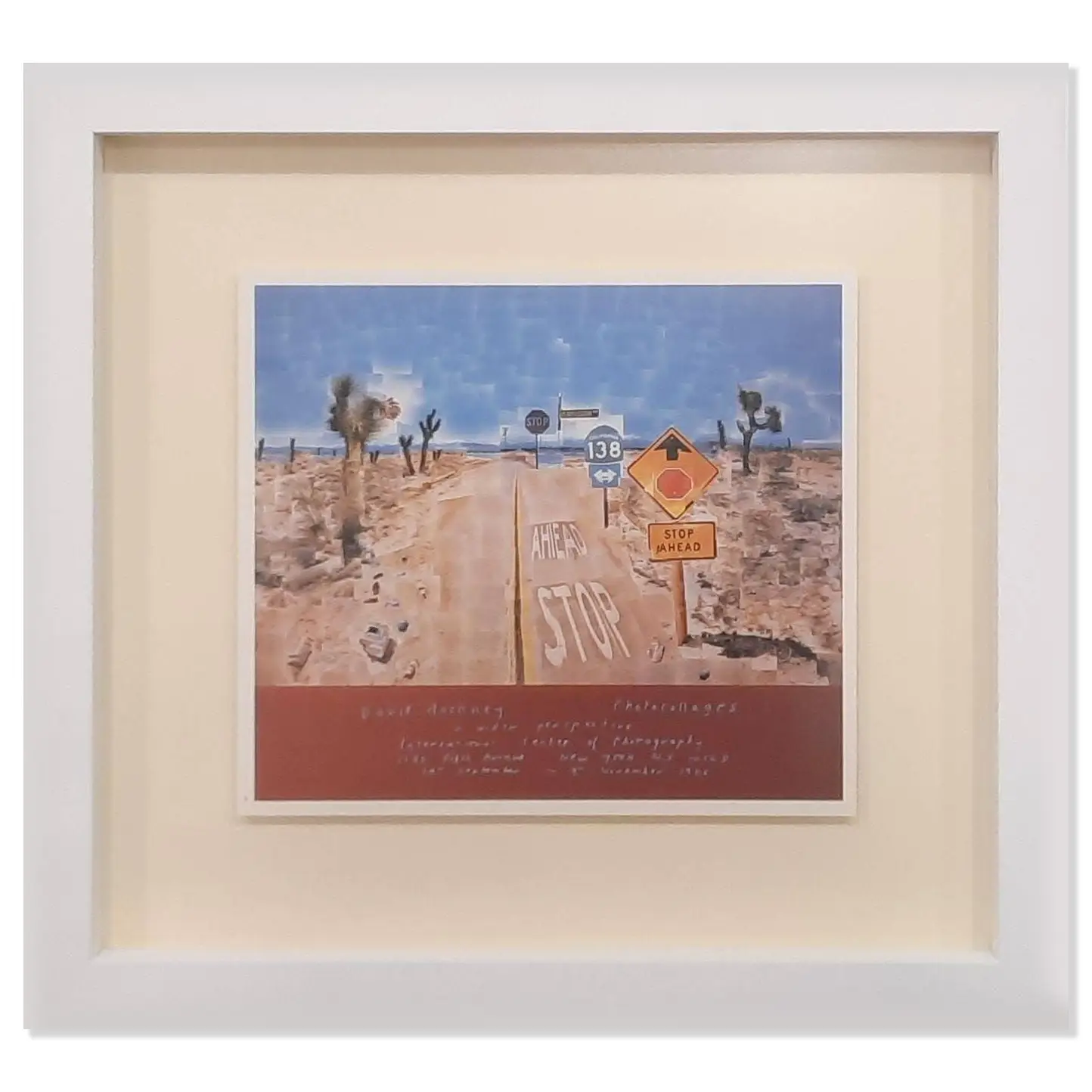 About this piece: This 1986 poster was created by David Hockney for an exhibition held at the International Center of Photography in New York. The poster is a superb example of Hockney’s photo-collages, featuring a segment of the famous California State Route 138. Floated and framed in white with non reflective Artglass.