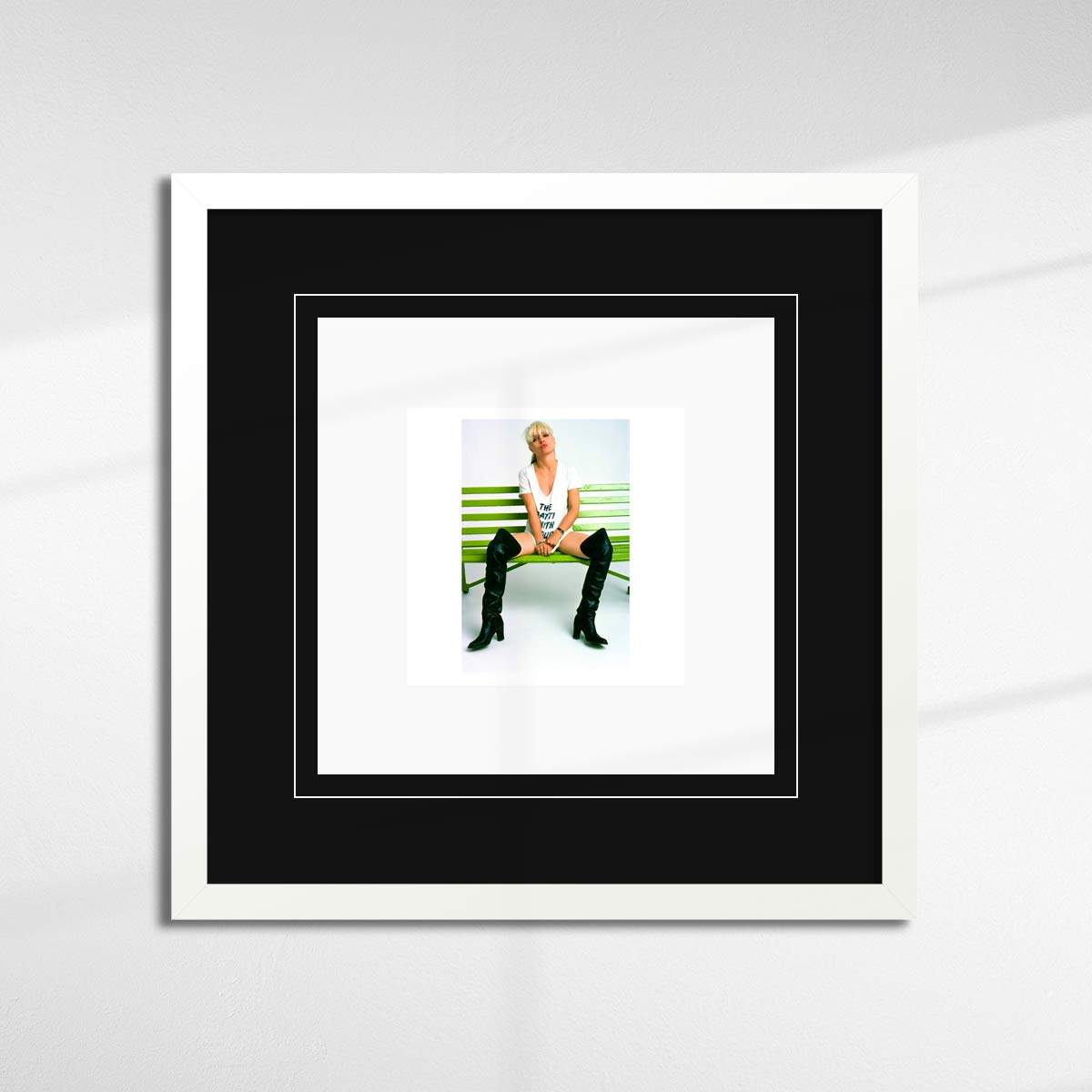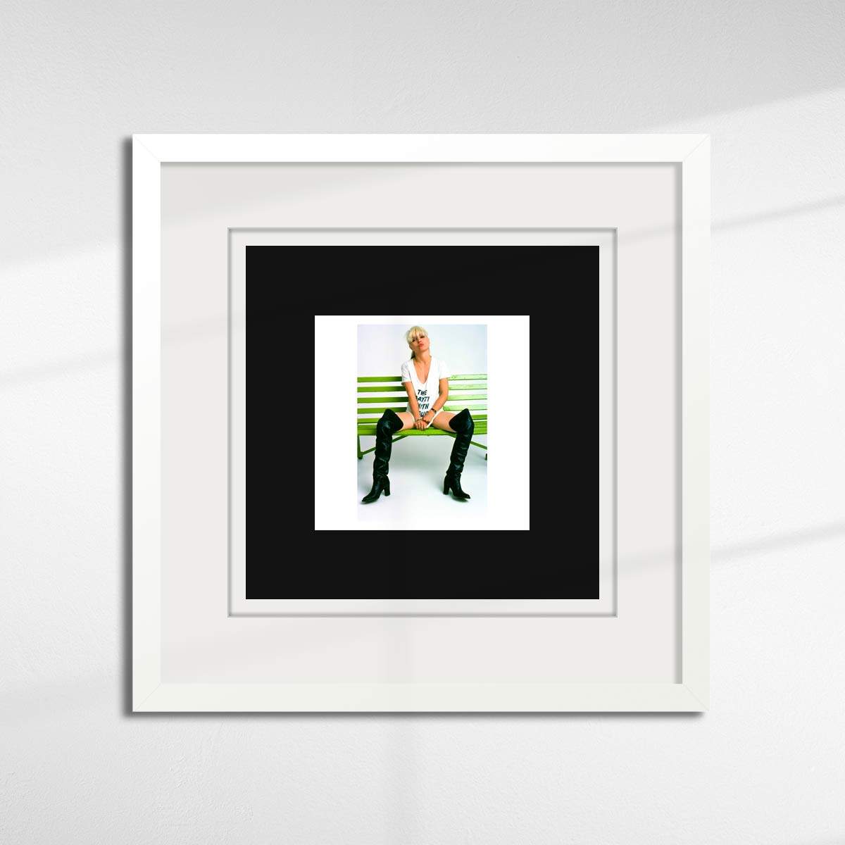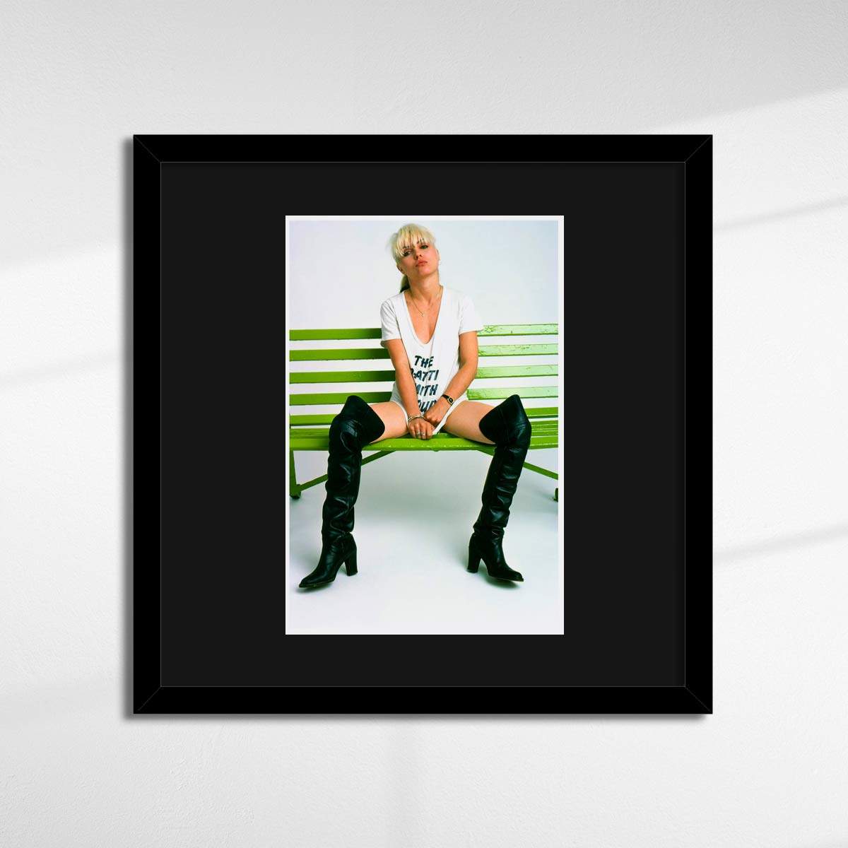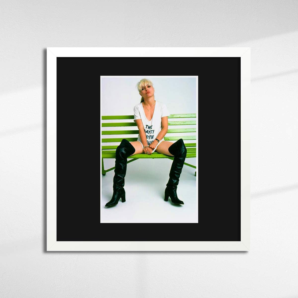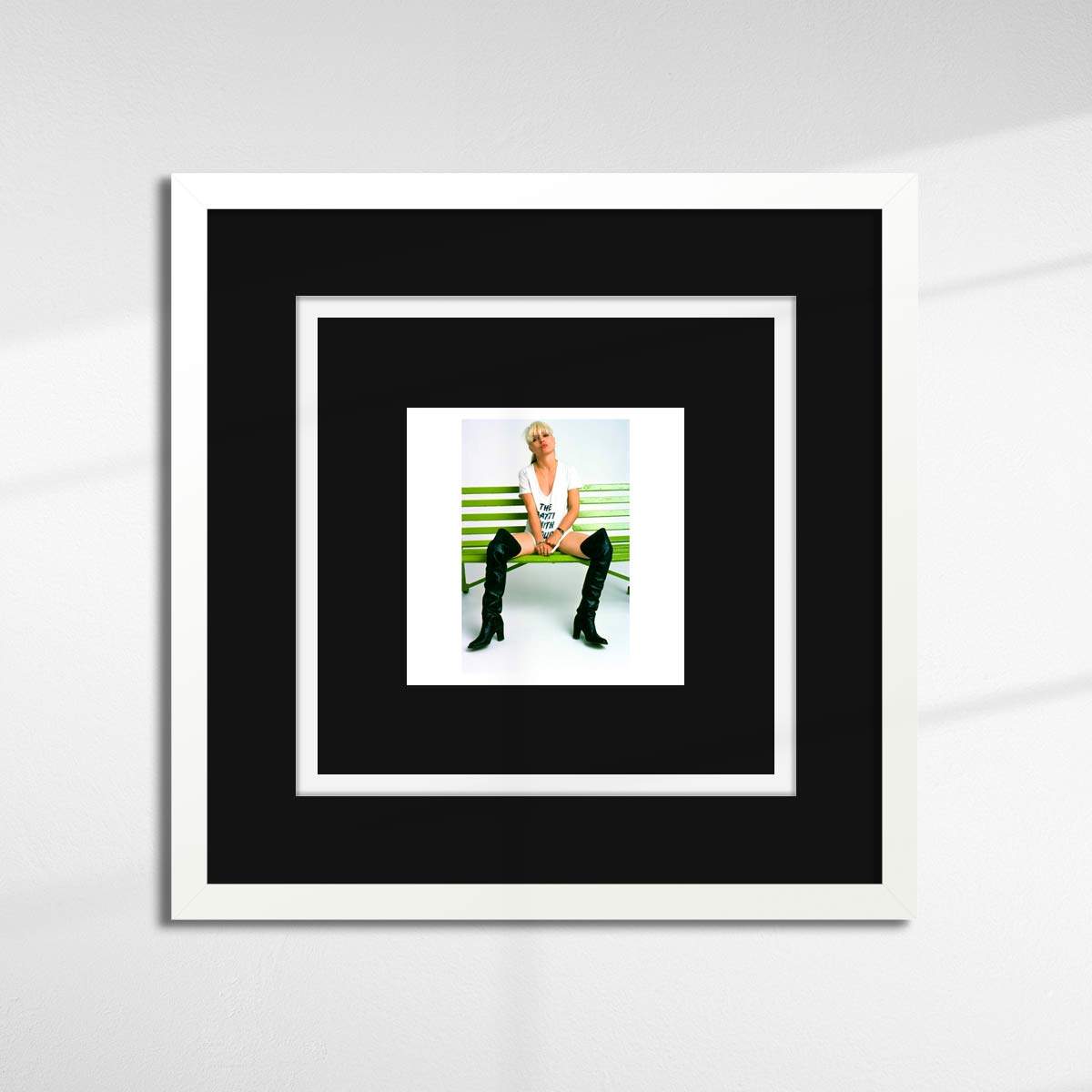 About this piece: Debbie Harry of ‘Blondie’ wearing a Patti Smith Group T-shirt shot by Duffy for the Observer Magazine in November 1977. This was one year before Blondie released her breakthrough album ‘Parallel Lines’ which reached number 1 in the UK Charts in 1978. The article was titled ‘Doing it Their way (like singing rock)’ and featured an interview with Debbie Harry who is described as ‘The Brigitte Bardot of rock.’ Archival Quality Pigment Ink Print comes ready to frame in a 19.75″ x 19.75″ (50cm x 50cm) mount with an image size of approx. 12″x 8.25″ (31cm x 21cm). The print is embossed with the Duffy Archive stamp. The reverse of each mount has a sticker detailing the history of the session and a hand-stamped logo from Duffy’s old camera cases.