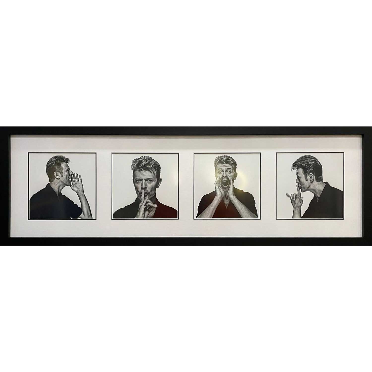 About this piece: A set of 4 images from the wonderful forty-minute photo shoot with Bowie by Gavin Evan’s which produced one of the most famous series of portraits ever taken of the iconic musician. Often referred to as “The Session”, the photo shoot’s aim was to create individual images that, when laid out on the page, would connect visually: ‘see no evil’, ‘hear no evil’ and ‘speak no evil’ but became redacted to simply ‘shh’ and ‘oi’. Images from the session have been used in the auction catalogues of Sotheby’s as well as appearing on the covers of Rolling Stone, Esquire and many more.