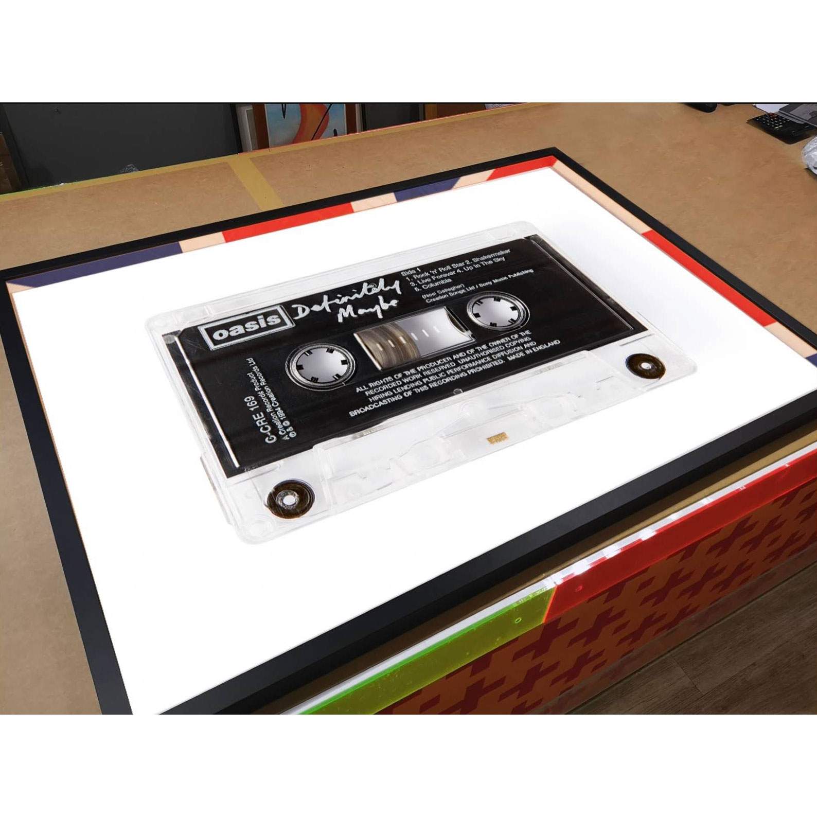 About this piece: Limited edition Oasis – Definitely Maybe cassette print with Artglass AR70 and bespoke inner frame. Comes with a signed certificate of authenticity. Unframed (print only) options also available.