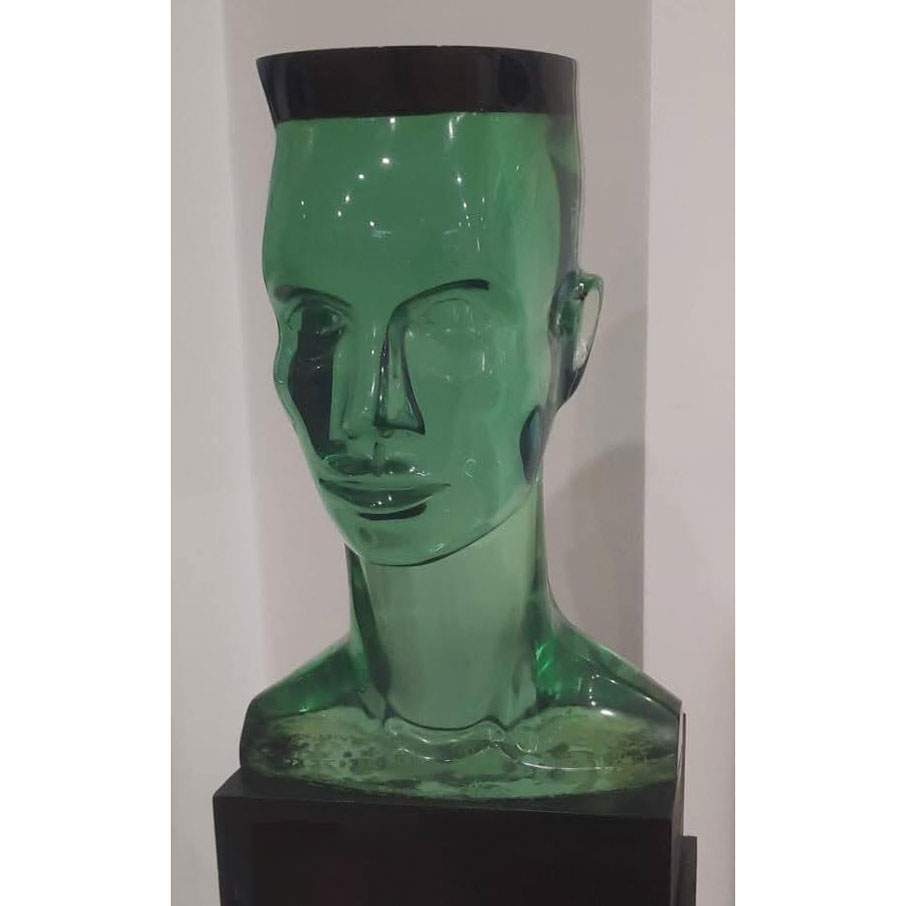 About this piece: Grace Jones (1985) – clay sculpture cast in acrylic resin by Guy Portelli. The robotic and futuristic portrait of Grace Jones has both references to Pop Art and science fiction. Cast in translucent acrylic resin it both reflects it’s surroundings as well as refracting the images through it.