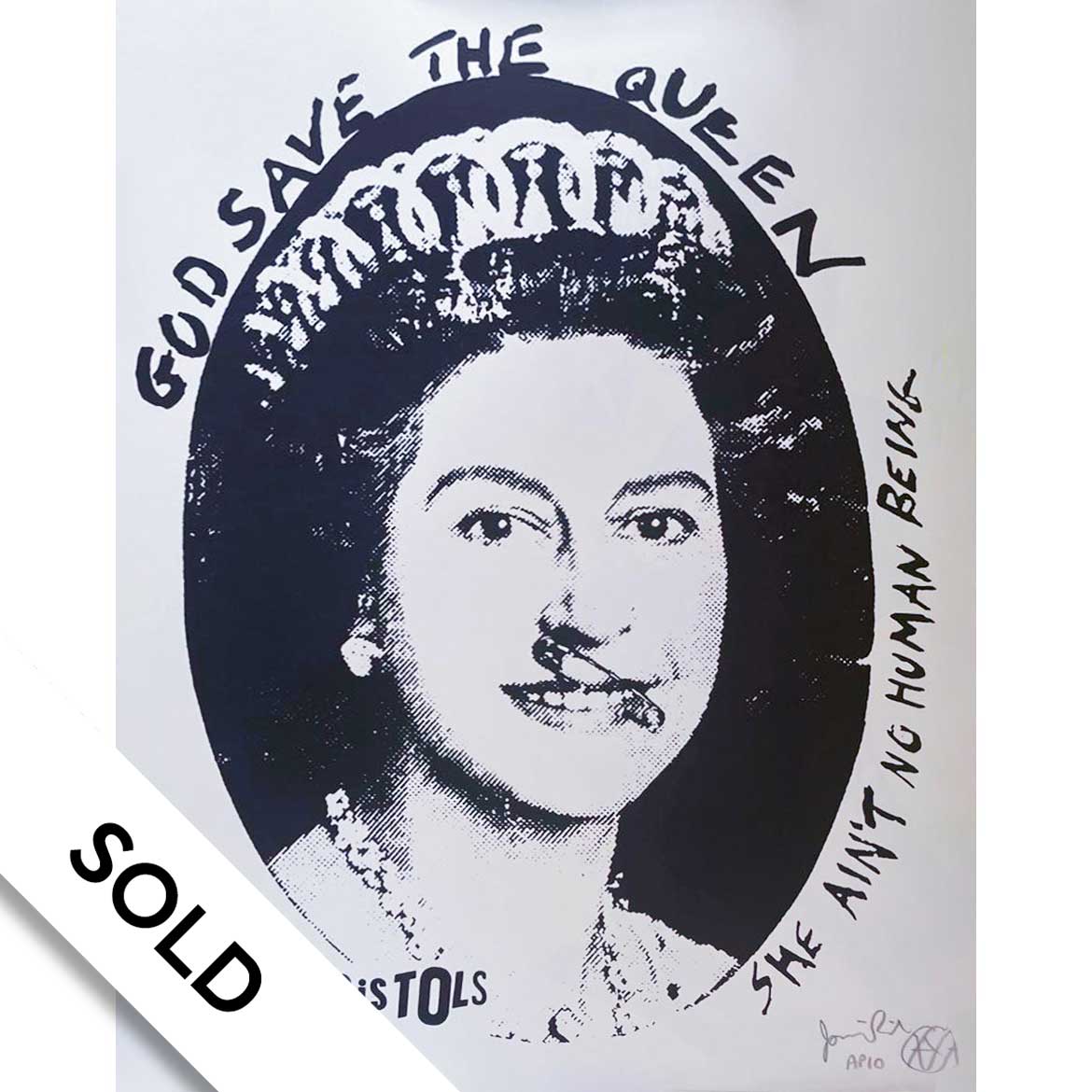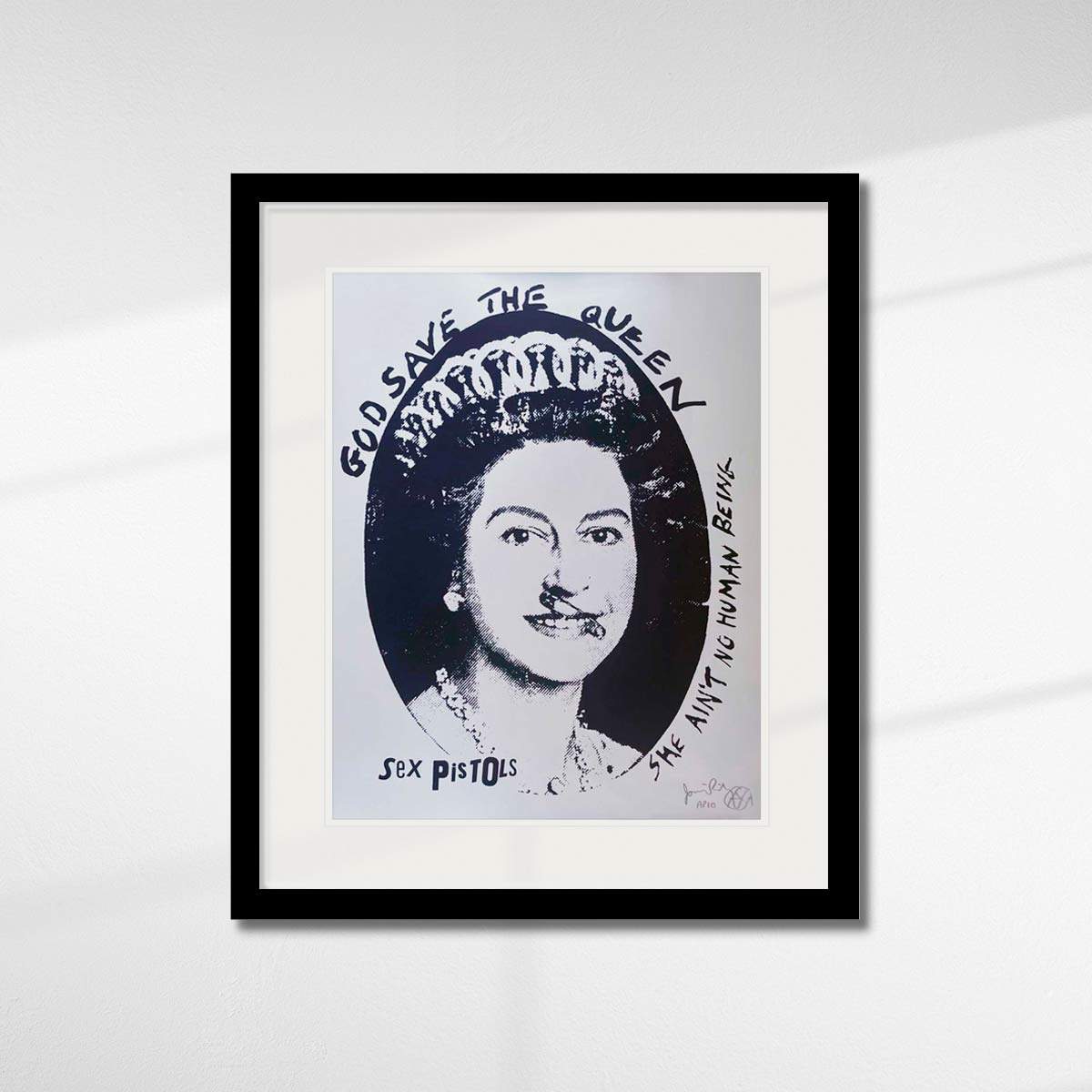 About this piece: Silkscreen print of Queen Elizabeth II with her eyes and mouth covered with the song title and band name in ransom note-style font. The silkscreen print is signed and numbered by the artist. Framed in black with museum Artglass non reflective and 70% UV protection.