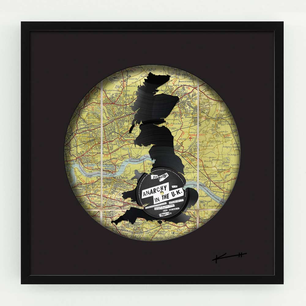 About this piece: Anarchy In The UK by Keith Haynes is an artwork cut from original 12” Sex Pistols’ Anarchy In The UK record on a vintage map in a black wood frame.
