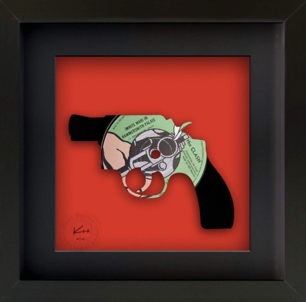 About this piece: Clash Guns – Hammersmith Palais by Keith Haynes is an artwork cut from Clash 7” vinyl single, in a black wood frame.