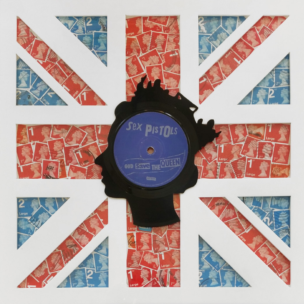 About this piece: God Save The Queen 7″ – Last Post Union Jack by Keith Haynes is an artwork cut from original Sex Pistols 7” (various) vinyl and used postage stamps presented in a perspex box frame. Each piece is unique and created from different original 7″ vinyl.