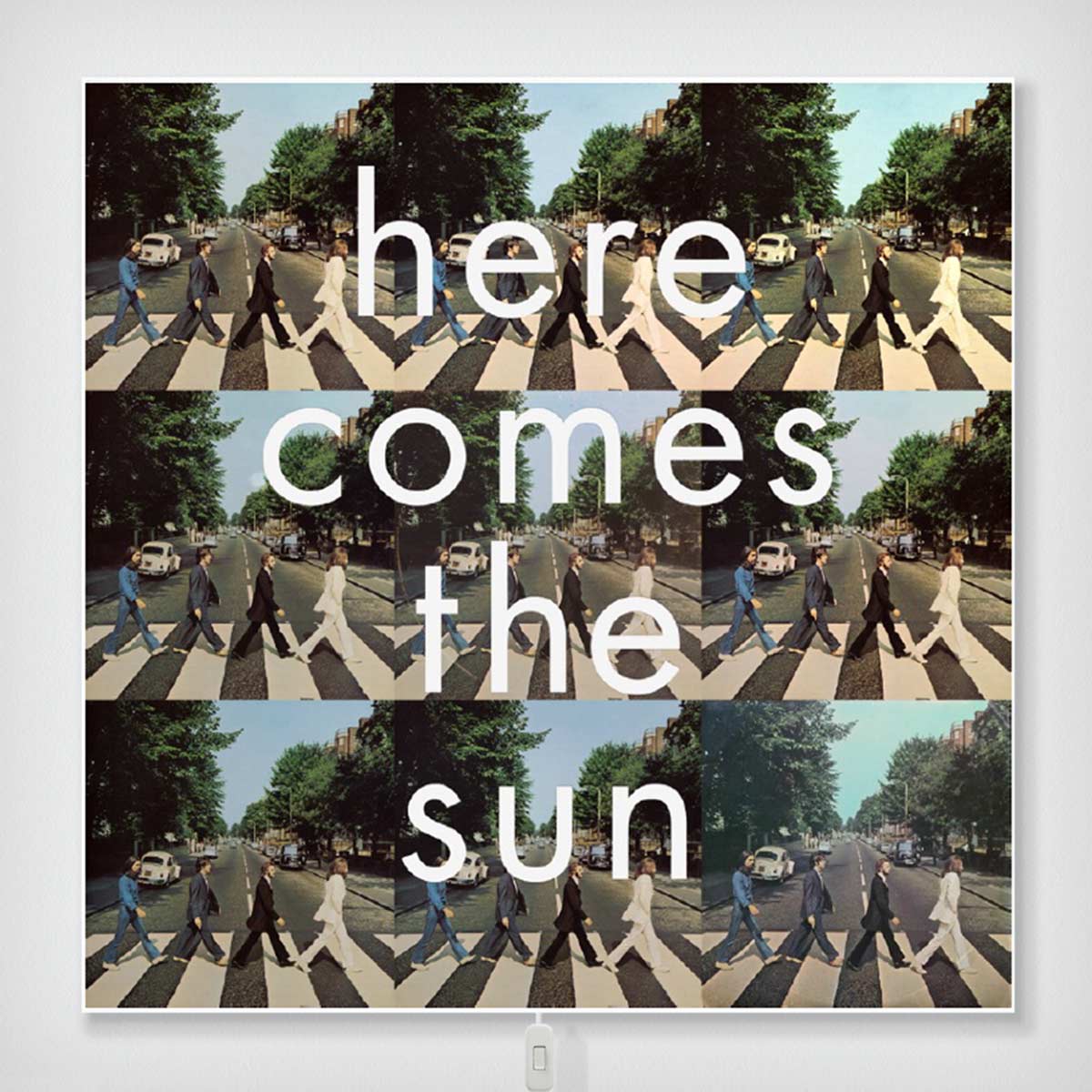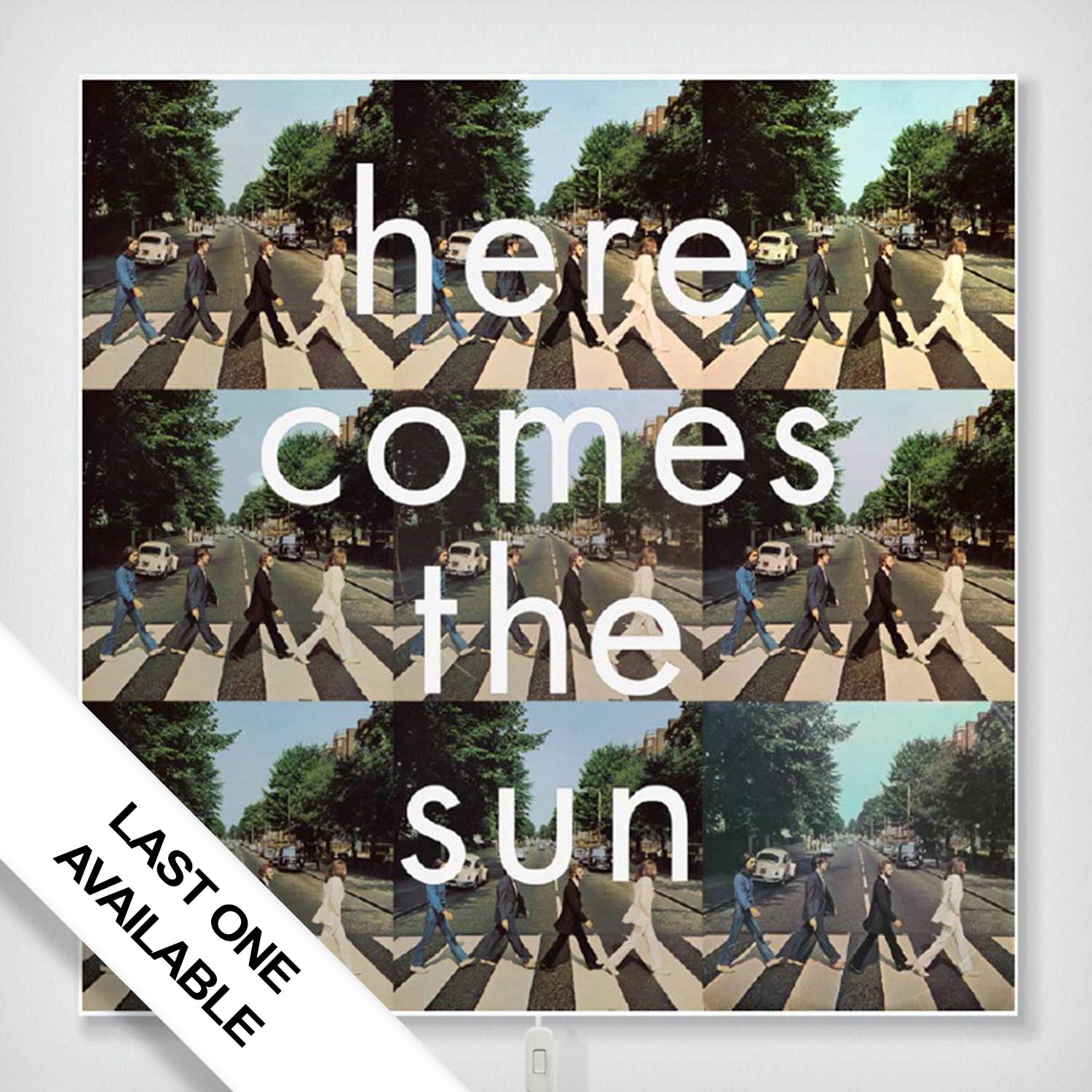 About this piece: Here Comes The Sun by Keith Haynes is an artwork made from original Beatles album sleeves and LED lightbox. The piece measures 90x90cm.