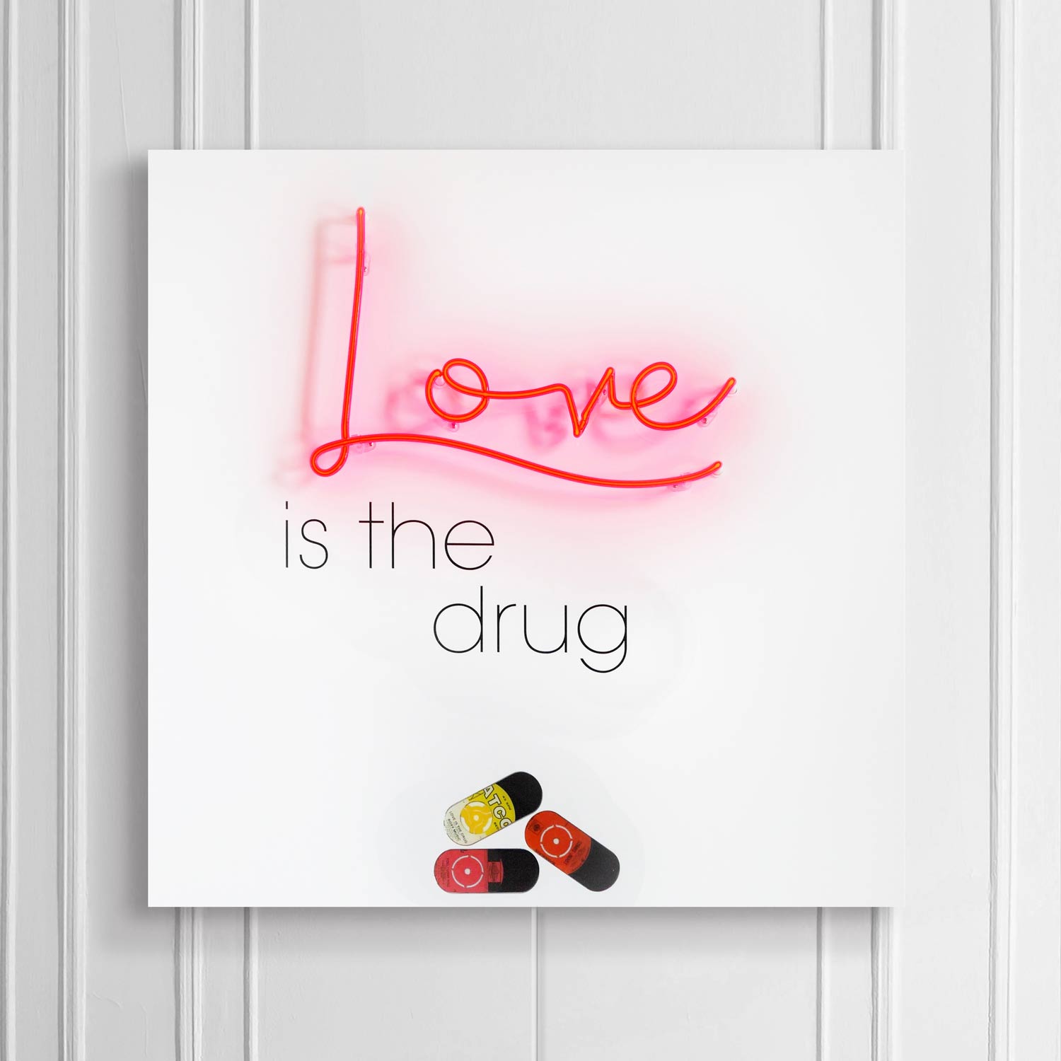 About this piece: Love Is The Drug by Keith Haynes is made from neon, perspex, resin and 7” vinyl single. The piece measures 90x90cm.
