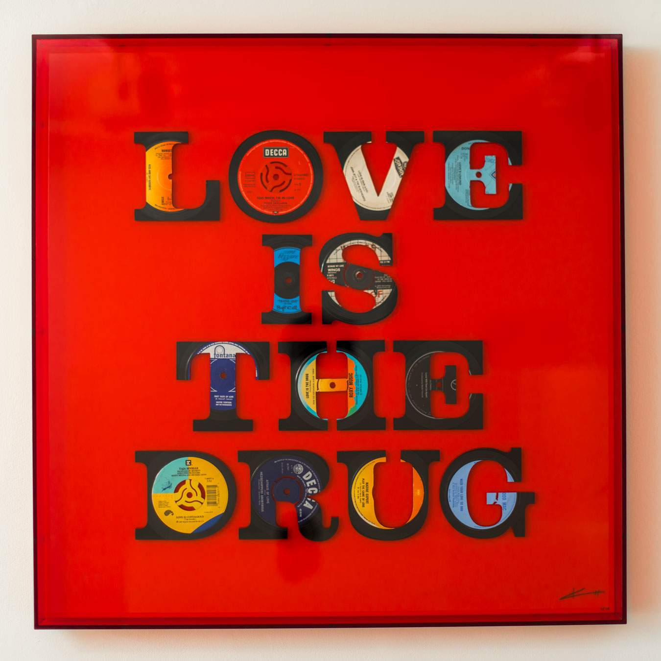 About this piece: Love Is The Drug. Cut from original 7” vinyl love songs. Signed and framed in a museum quality Perspex box case.