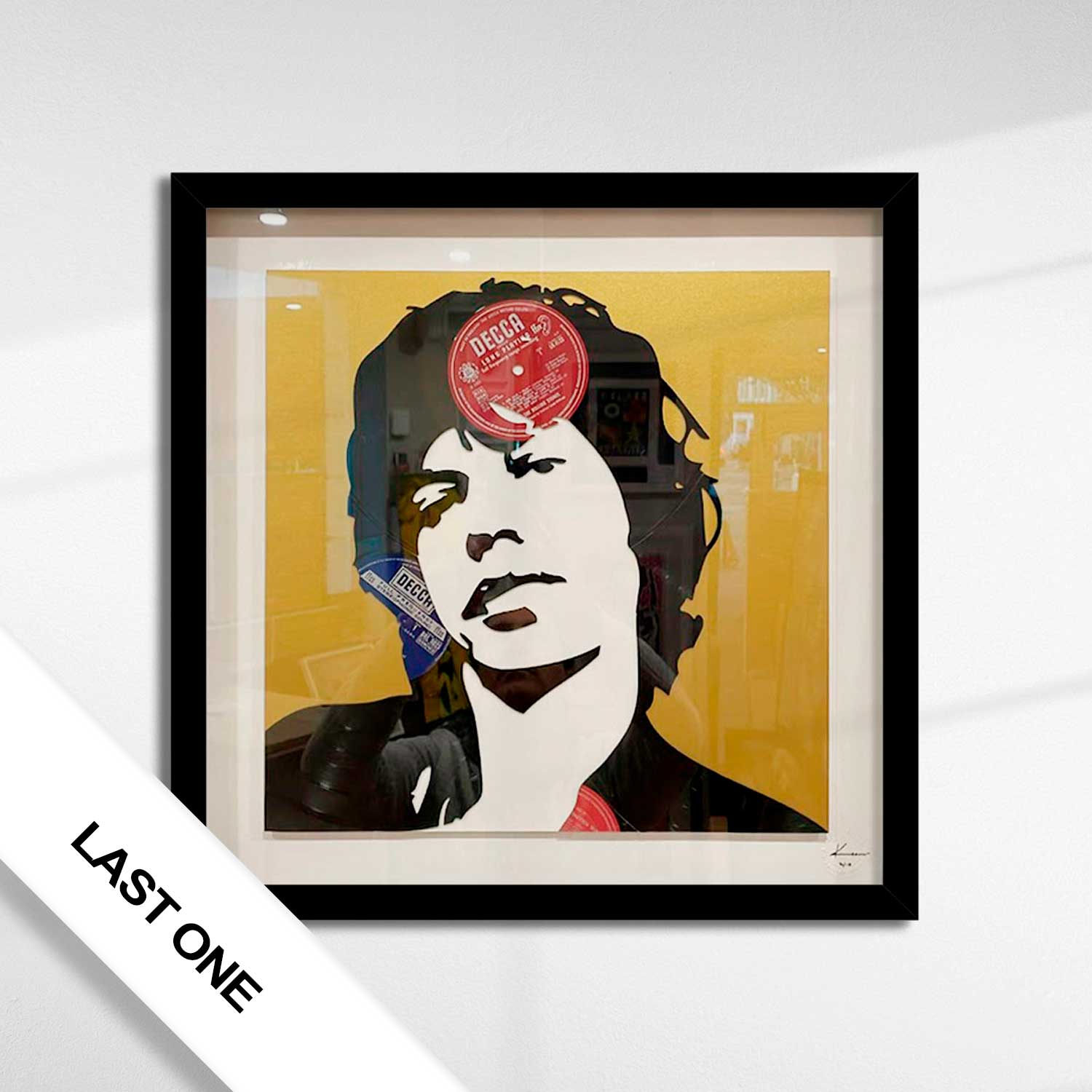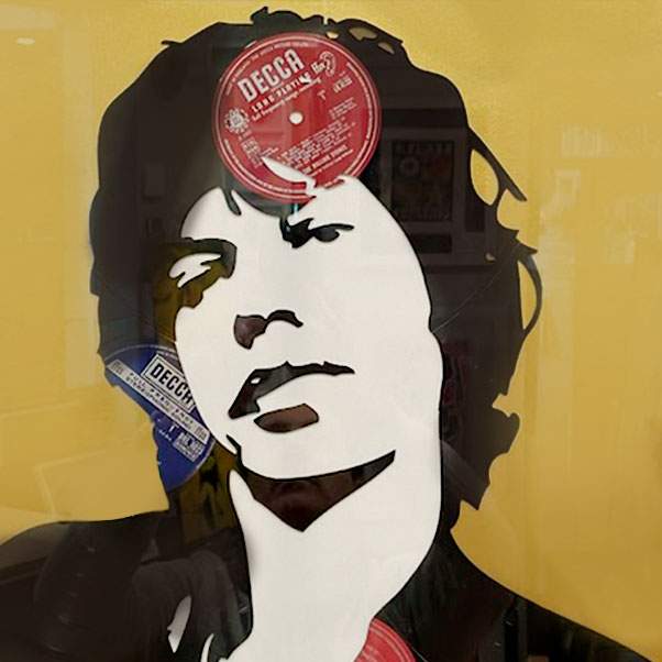 About this piece: Mick Jagger – by Keith Haynes is a mixed media artwork cut from original 12” vinyl. Presented in a black box frame.