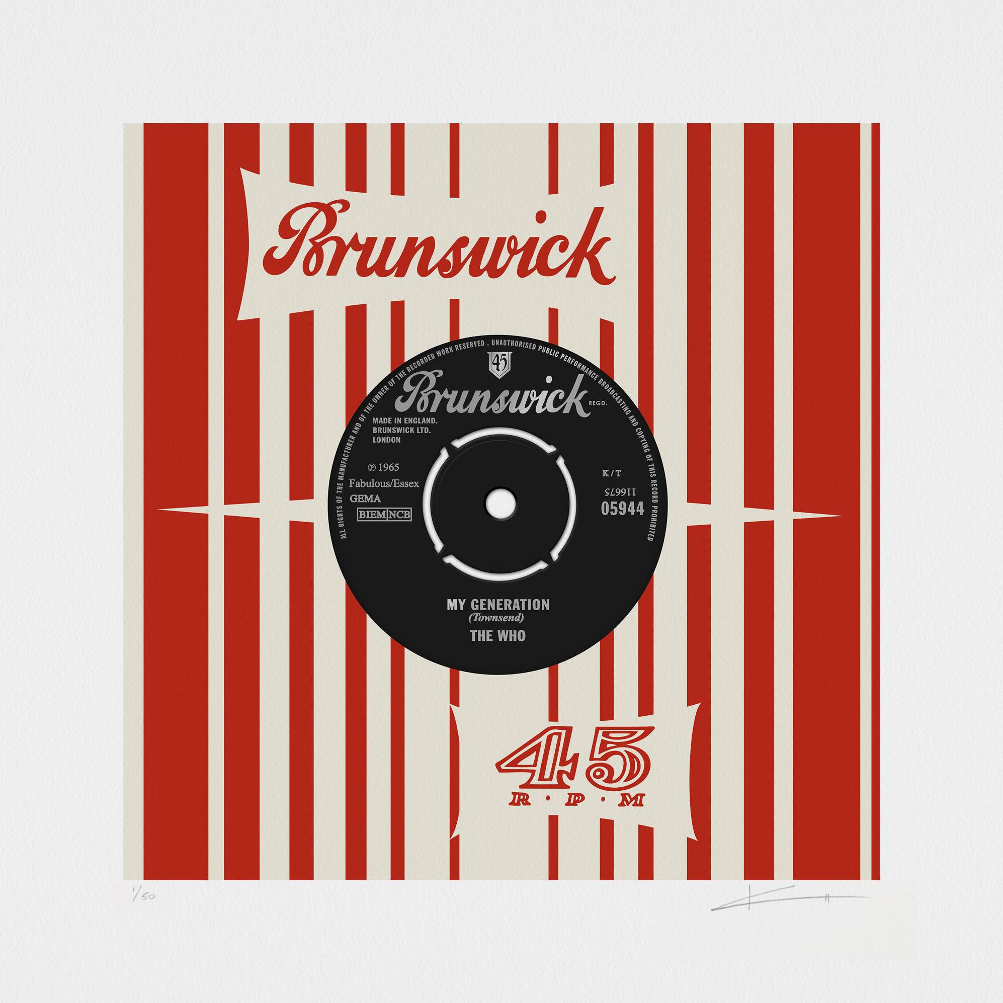 About this piece: My Generation – The Who by Keith Haynes. From a new print series of digitally redrawn artworks celebrating hit singles on 45 in house sleeves. Limited edition archival print on Somerset paper.