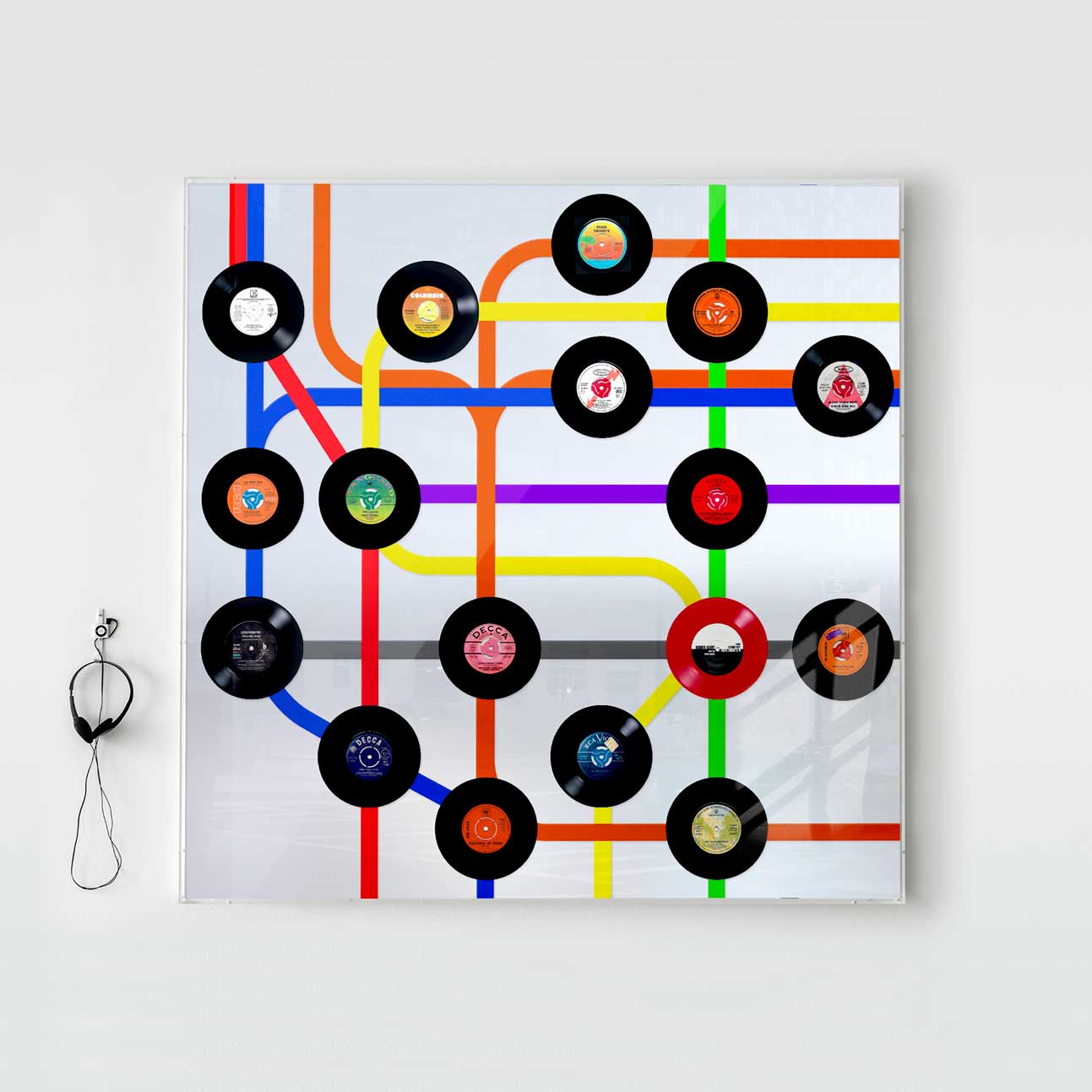 About this piece: New York Subway #5 by Keith Haynes is a unque mixed media map of the New York subway created from original 7″ vinyl records featuring song titles on the NY Subway.