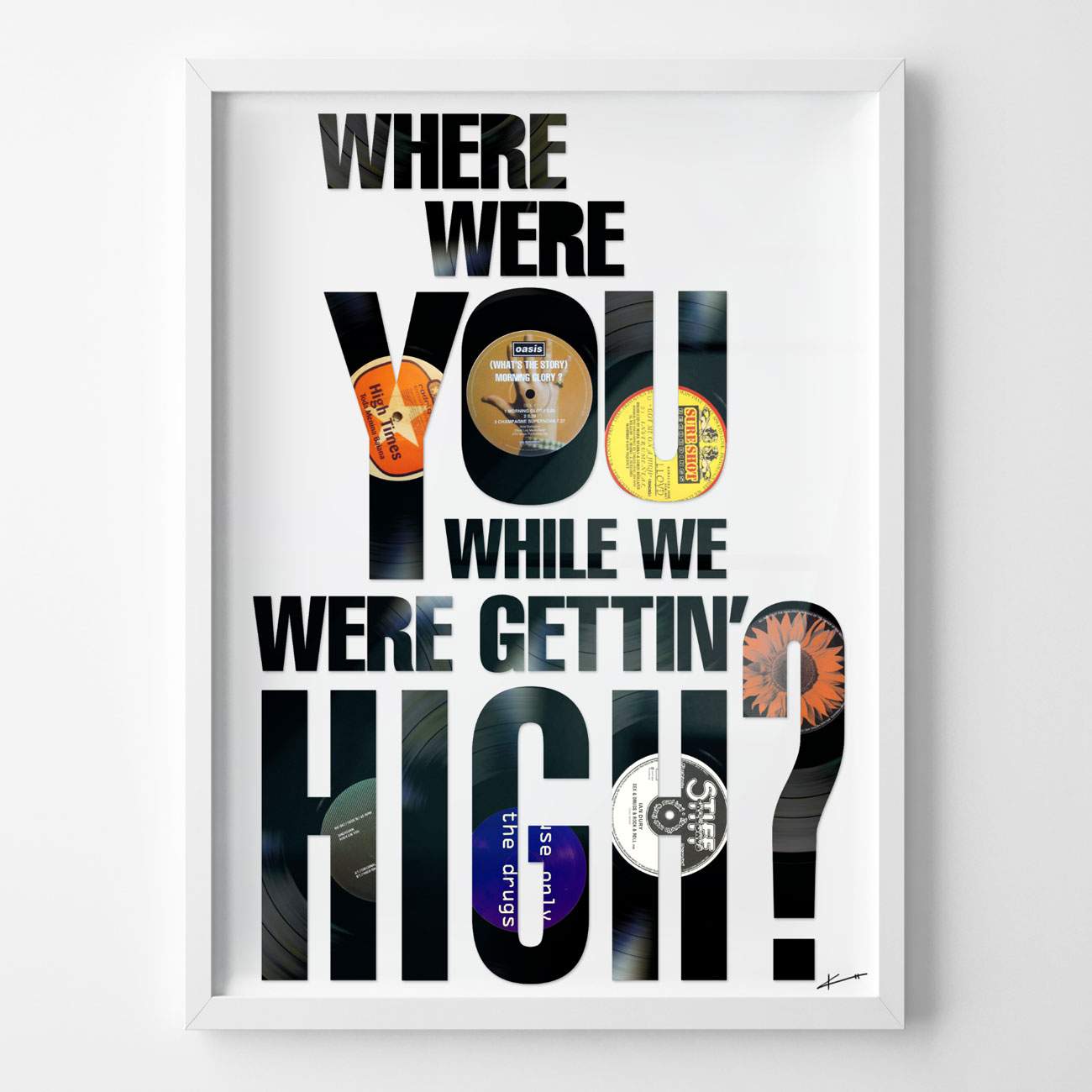 About this piece: Oasis – Gettin’ High? by Keith Haynes is an artwork cut from original vinyl records by Oasis and presented in a white box frame. Signed and numbered by Keith Haynes.