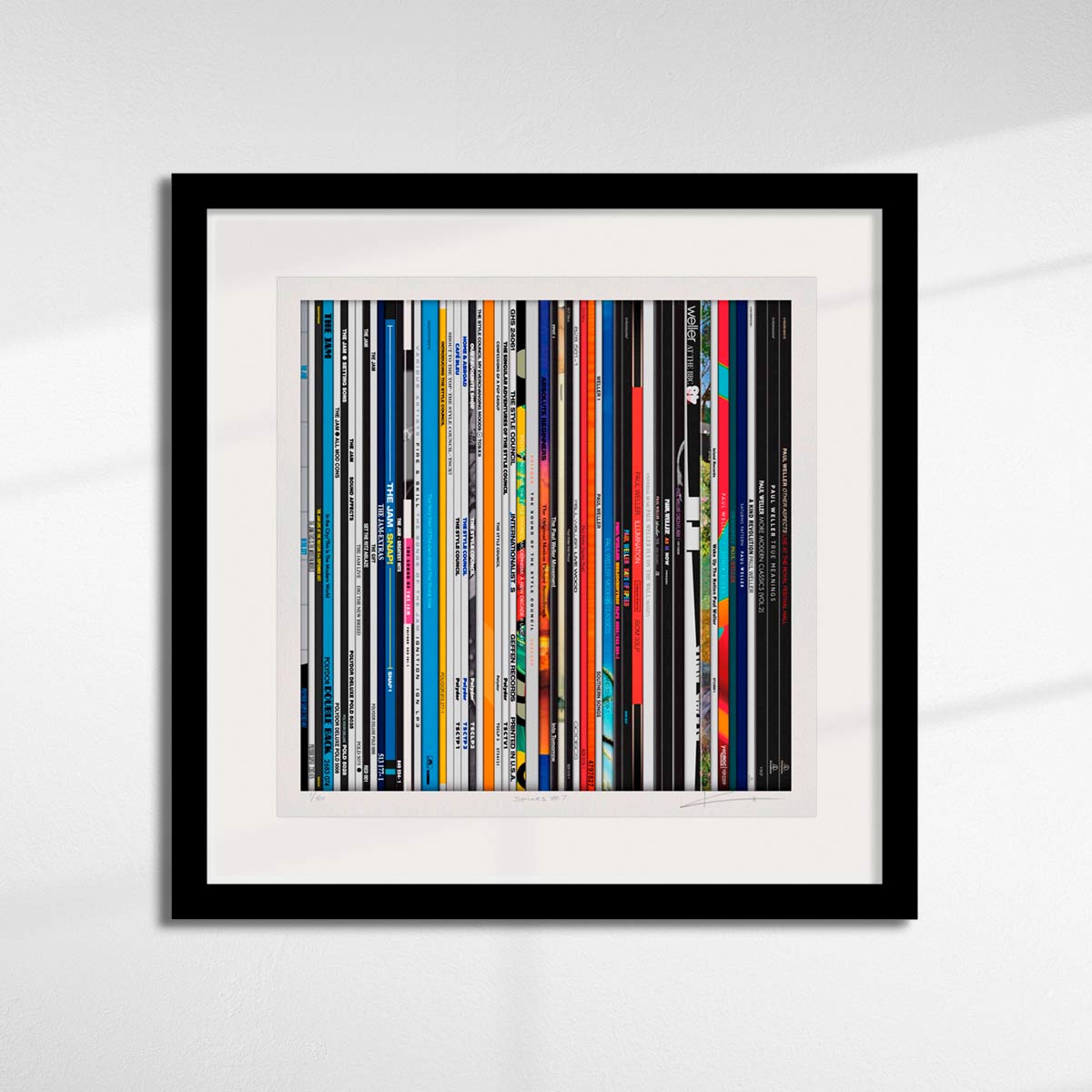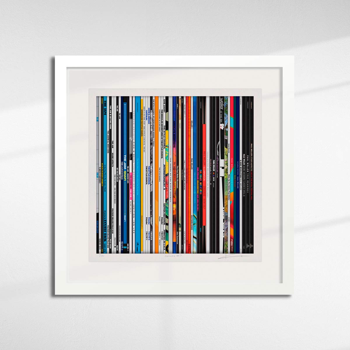 About this piece: Spines 7 – Paul Weller by Keith Haynes. A recreation the spines of fifty five 12-inch singles and albums by “The Modfather” Paul Weller, The Jam and The Style Council.  Archival print on Somerset paper with silkscreen varnish.