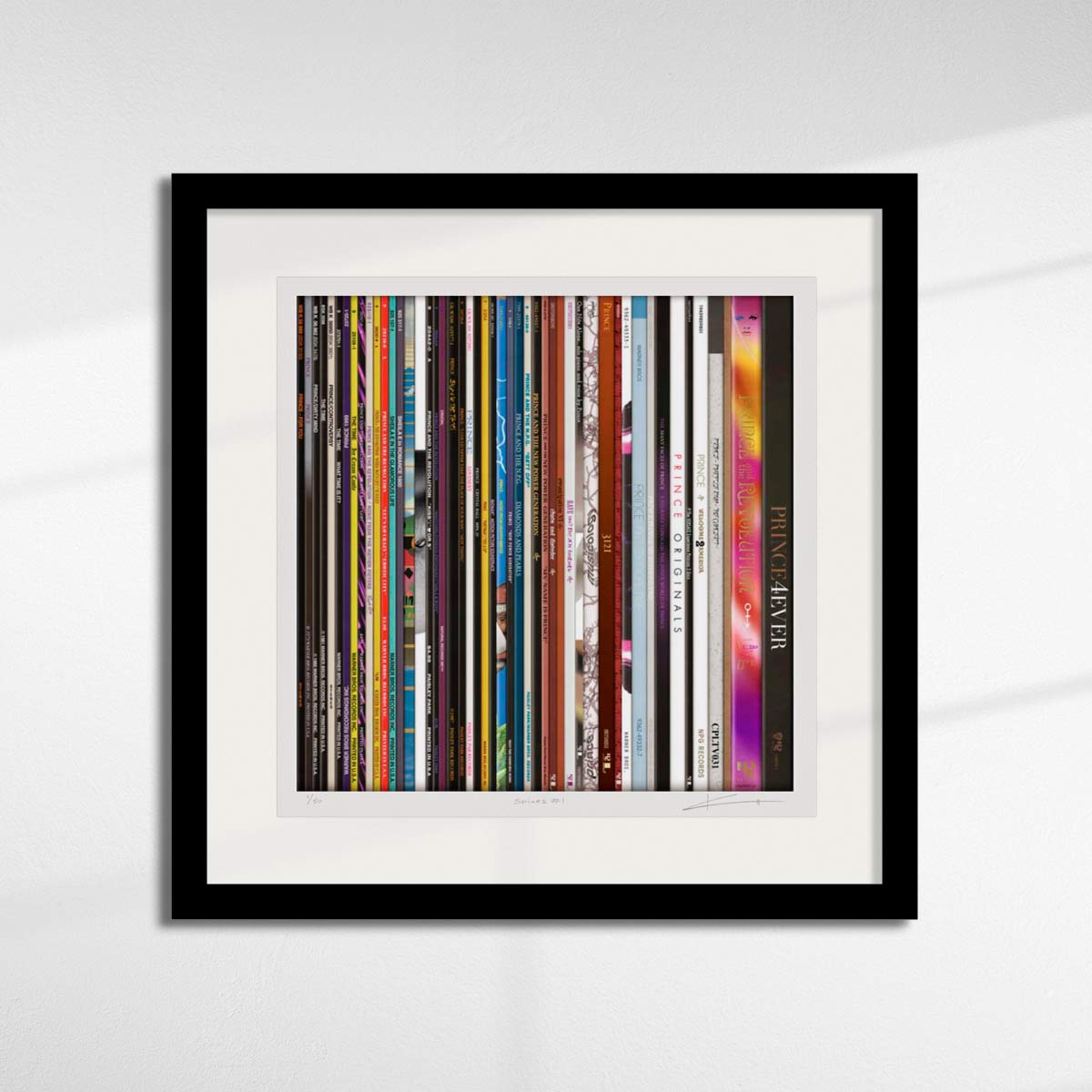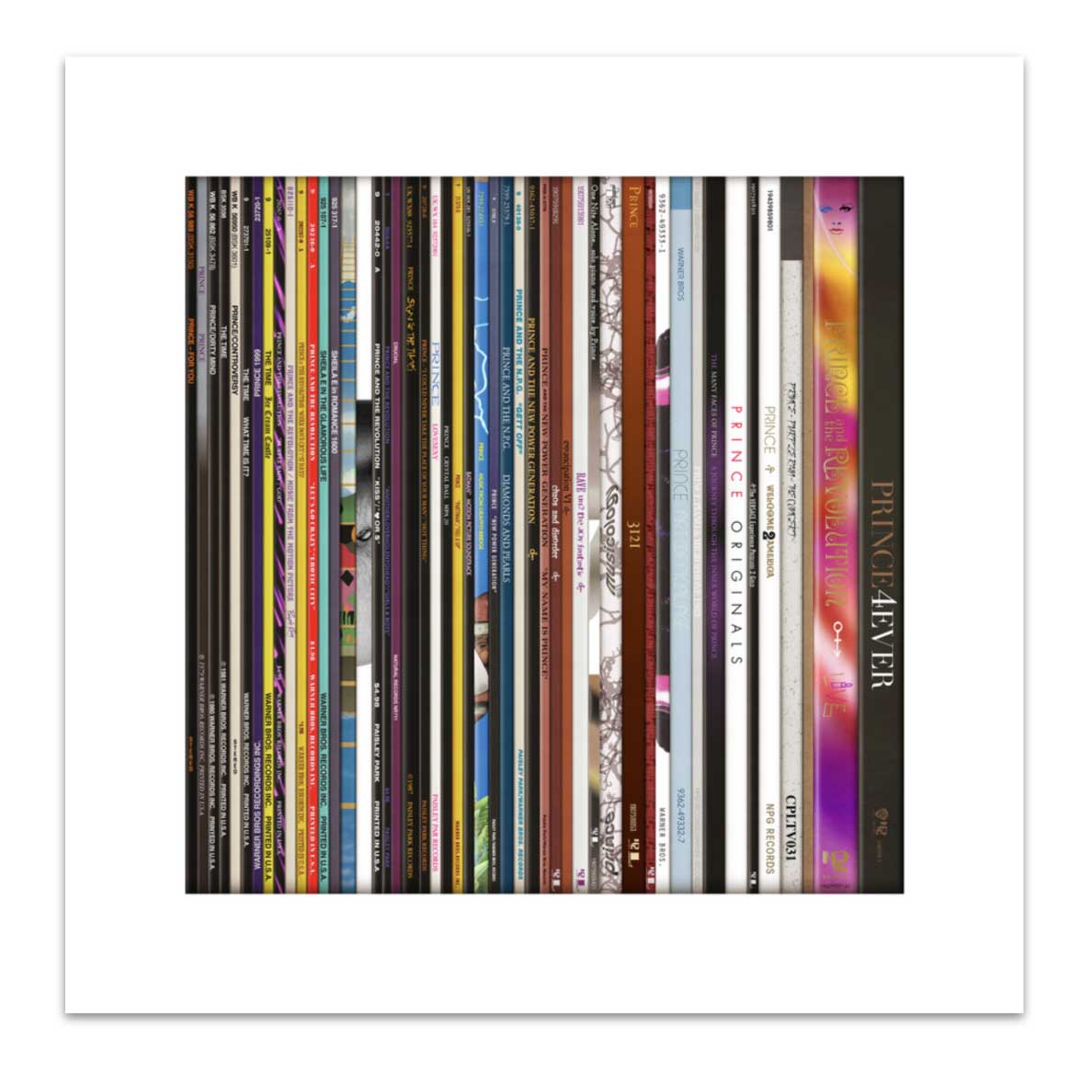 About this piece: Spines 9 – Prince by Keith Haynes. Keith Haynes recreates the spines of 49 vinyl records by Prince. This is not a photograph – it is a drawing that Keith makes from scratch, painstakingly recreating and combining each spine into the overall artwork. Archival print on Somerset paper with silkscreen varnish.