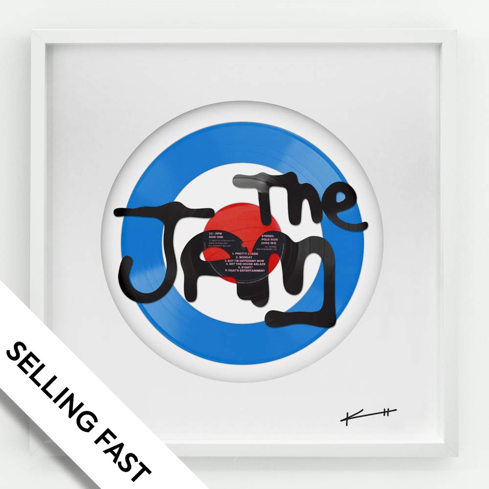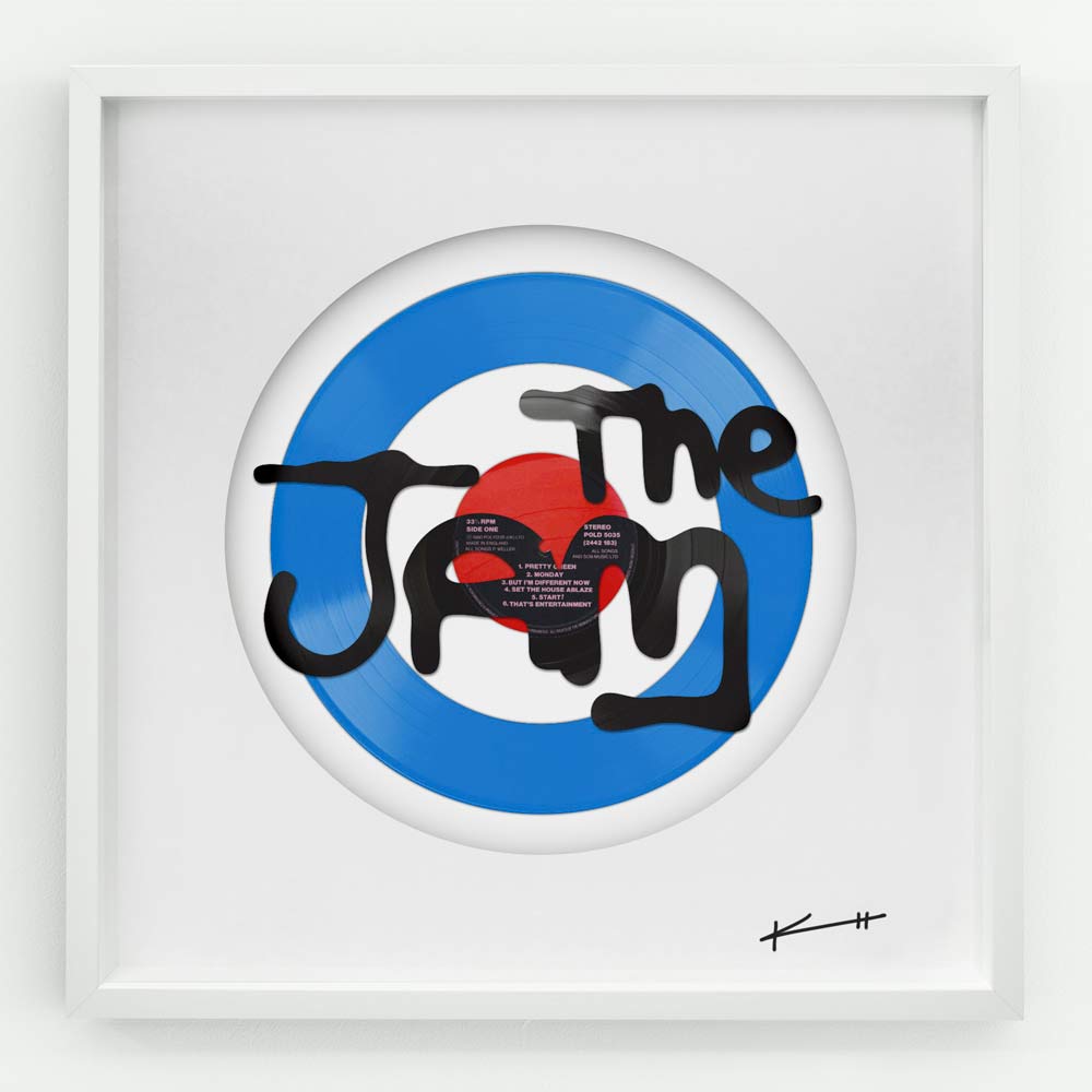 About this piece: The Jam by Keith Haynes is an artwork cut from an original Jam 12” vinyl record and red and blue vinyl in a white wood frame.