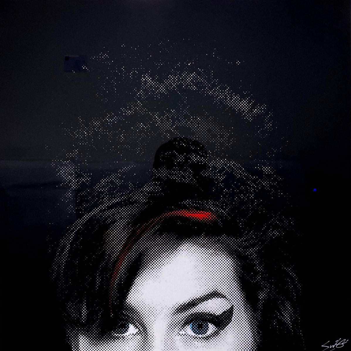 About this piece: Amy Winehouse had such an iconic image with her beehive hairdo and eye make up that it’s possible to see exactly who the portrait is even though only part of her face is visible. It references the title of her second and final studio album “Back To Black” released on 27 October 2006