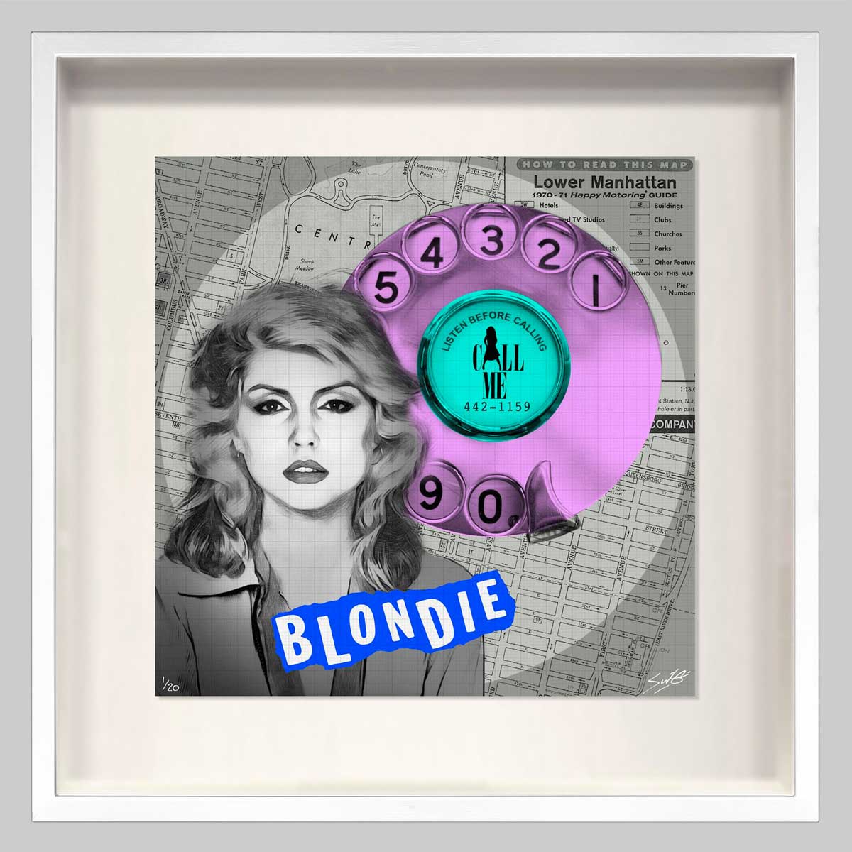 About this piece: “Call Me” was the theme to the 1980 film American Gigolo starring Richard Gere as a high class male escort and featured in the opening sequence of the film. It was written by electronic / disco legend Giorgio Moroder with lyrics and vocals by Debbie Harry. Released in the US in early 1980 as a Blondie single, “Call Me” was No. 1 for six consecutive weeks on the Billboard Hot 100 chart, where it became the band’s biggest single. It also hit No. 1 in the UK and Canada. In the year-end chart of 1980, it was Billboard’s No. 1 single. The artwork features a map of midtown Manhattan, which is synonymous with Debbie Harry and Blondie. The 1980’s public payphone dial features a “Debbie Harry calling card” on the dial, inspired by the type of cards escorts used to leave in public payphones. The “A” is a silhouette of the iconic singer and the telephone number references some of the bands songs: Detroit 442 and 11:59.