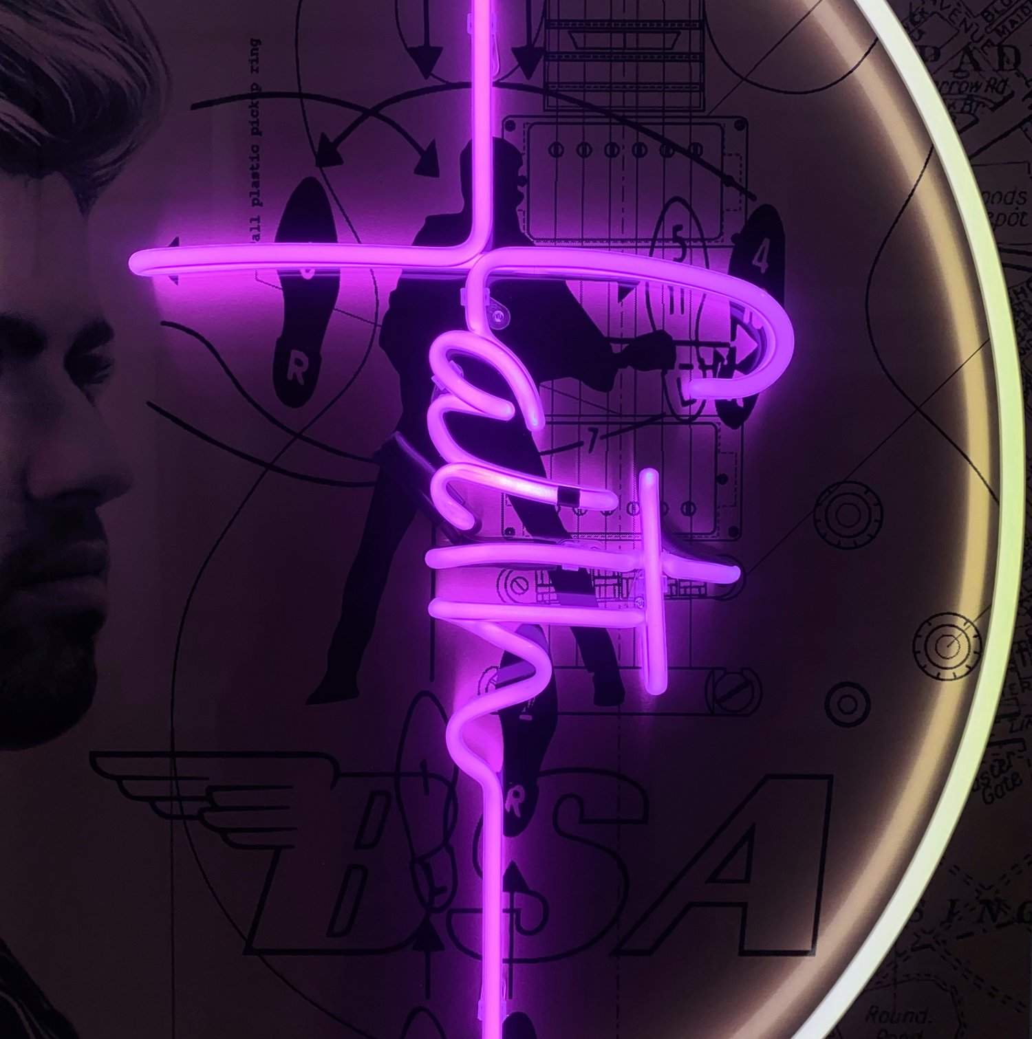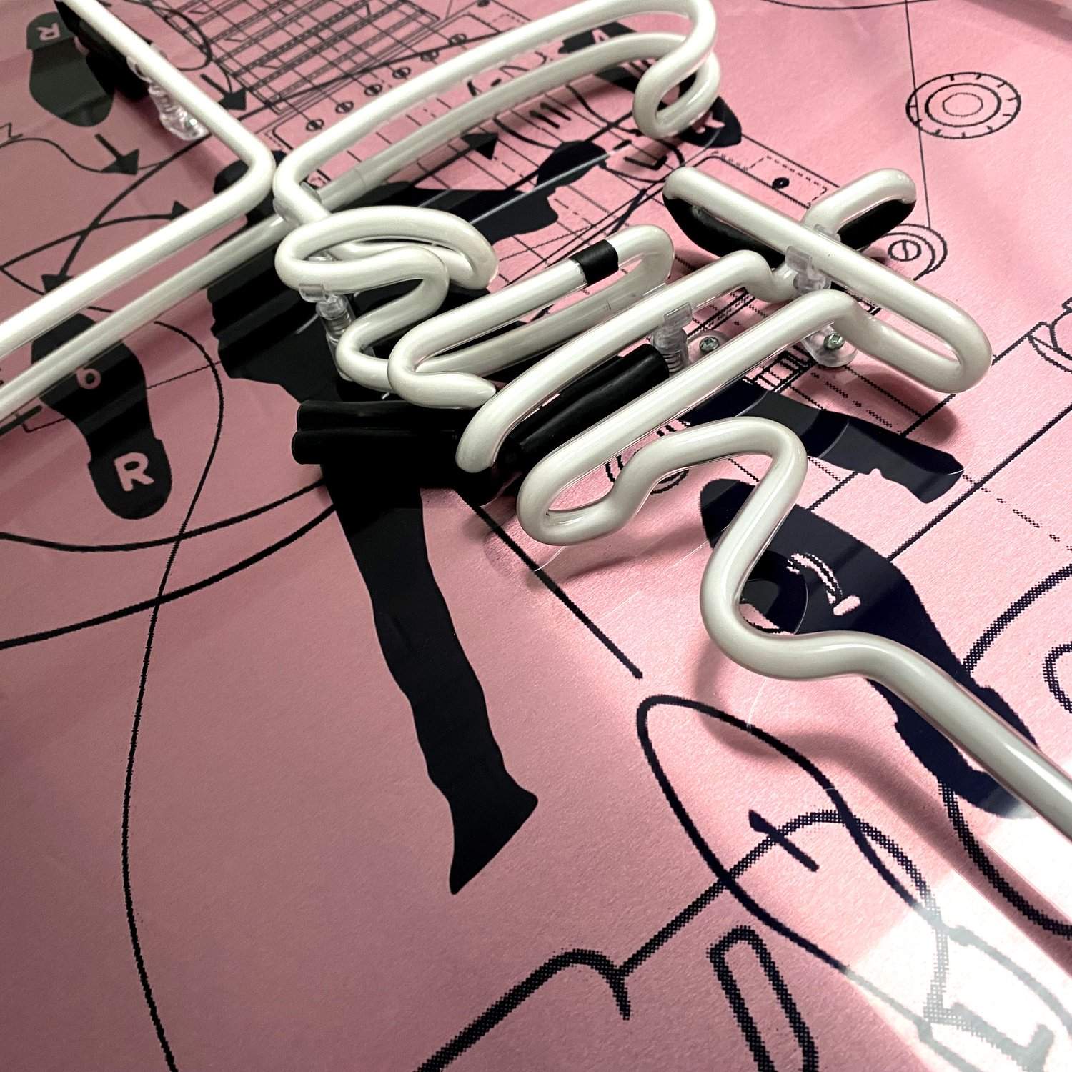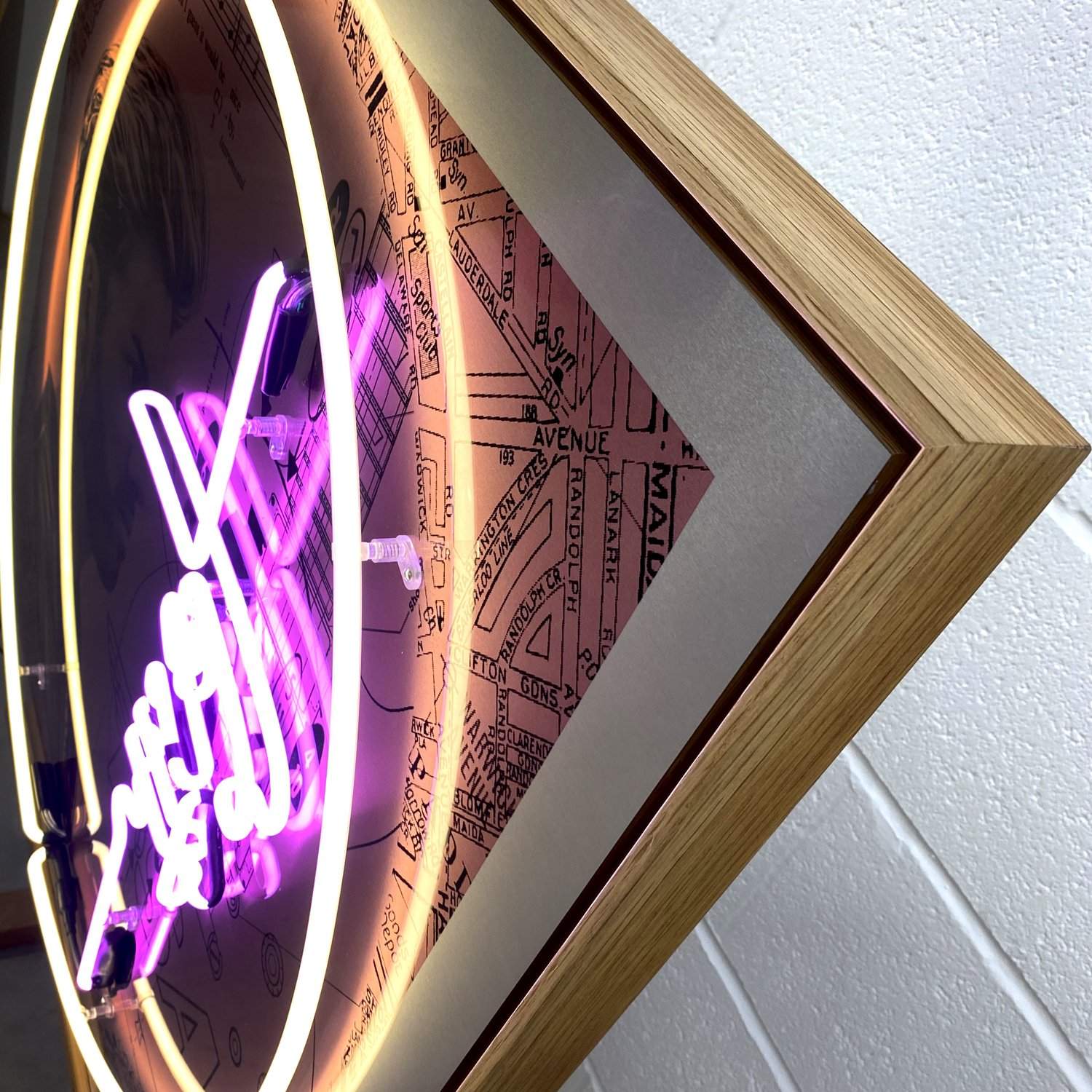 Traditional hand crafted glass tubes which are vacuum filled with neon and argon gas. They are mounted high grade brushed aluminium artwork with a flawless high gloss finish and float mounted in a bespoke oak frame. Colour: Magenta and warm white neon lights on rose gold aluminium.