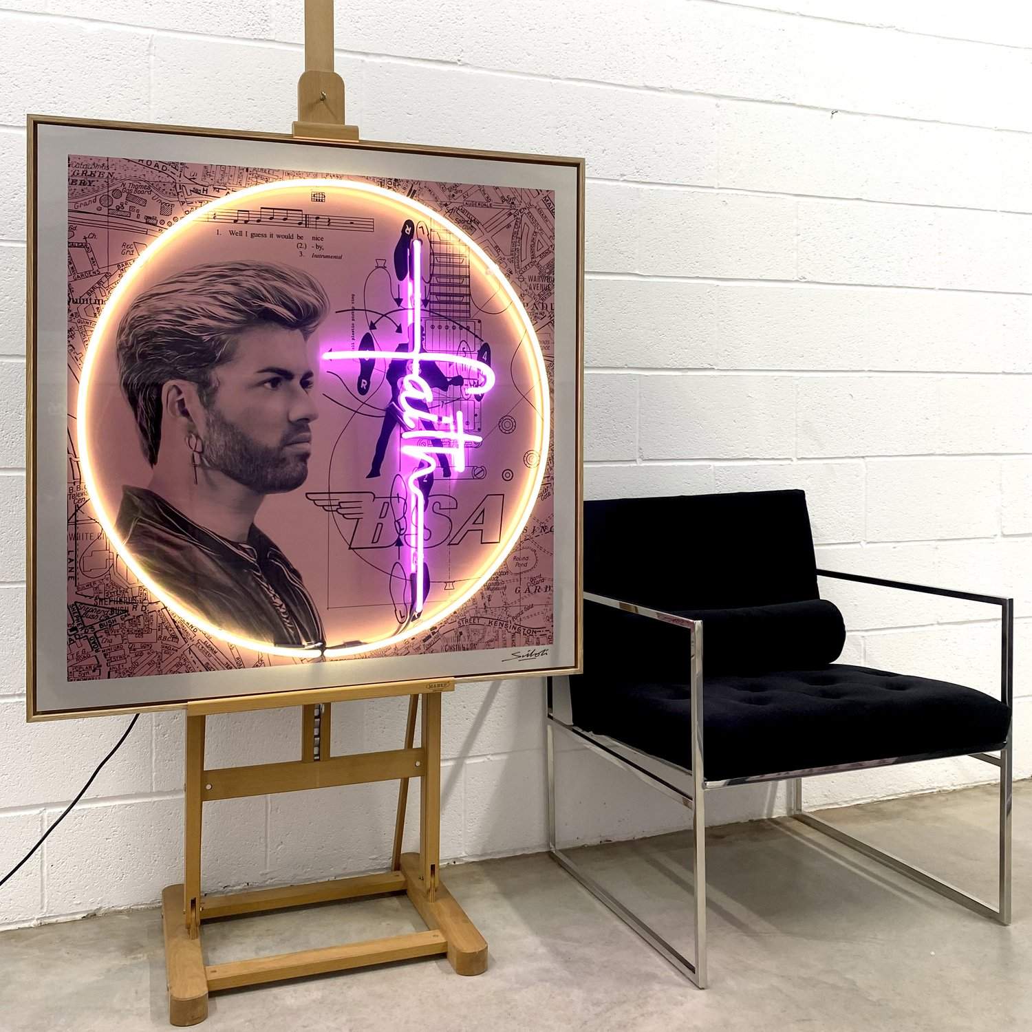 The artwork features a side profile of George Michael, his gaze fixated on a vibrant magenta neon cross. The neon flawlessly weaves the very title of the track, “FAITH,” into its intricate glass design.