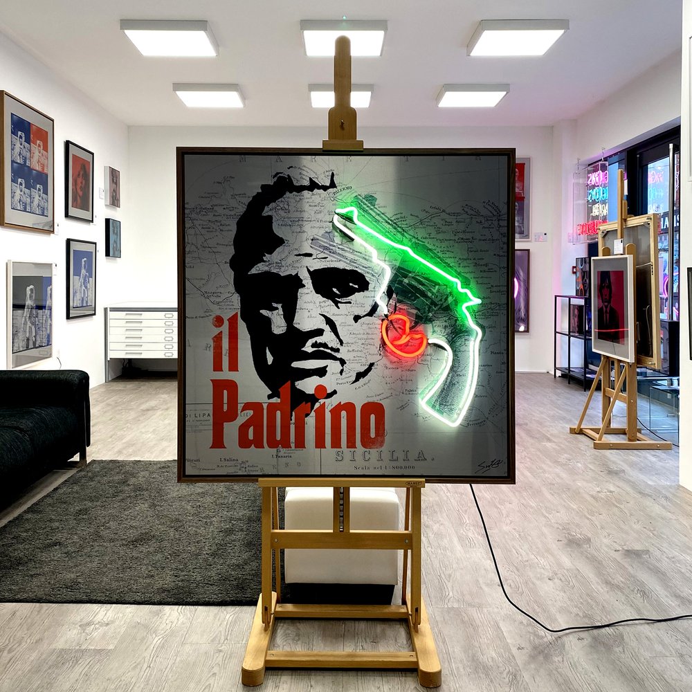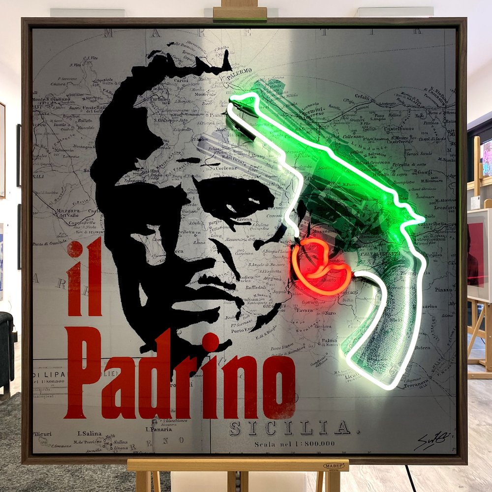 About this piece: The Godfather is widely regarded as one of the greatest films of all time and is also my personal favourite film of all time. The Godfather featured Marlon Brando as Don Vito Corleone, the head of a powerful Italian-American crime family. “Il Padrino” Marlon Brando by Loius Sidoli is a collage style artwork featuring a map of Sicily showing the village of Corleone – the birth place of Don Vito.