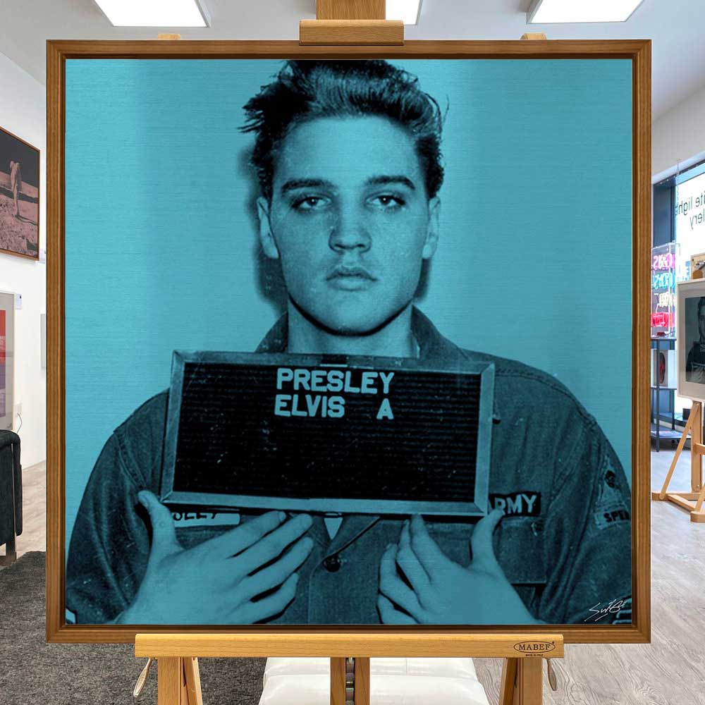 About this piece: The mugshot used to create this limited edition was his de-mob photo taken shortly before he was discharged on March 5th 1960. By 1956 Elvis was already a global superstar, but like all young American men at that time he was required to do National Service. Although he was offered the chance to enlist in special services to entertain troops, he chose to serve as a regular soldier, which earned him respect in the public eye.