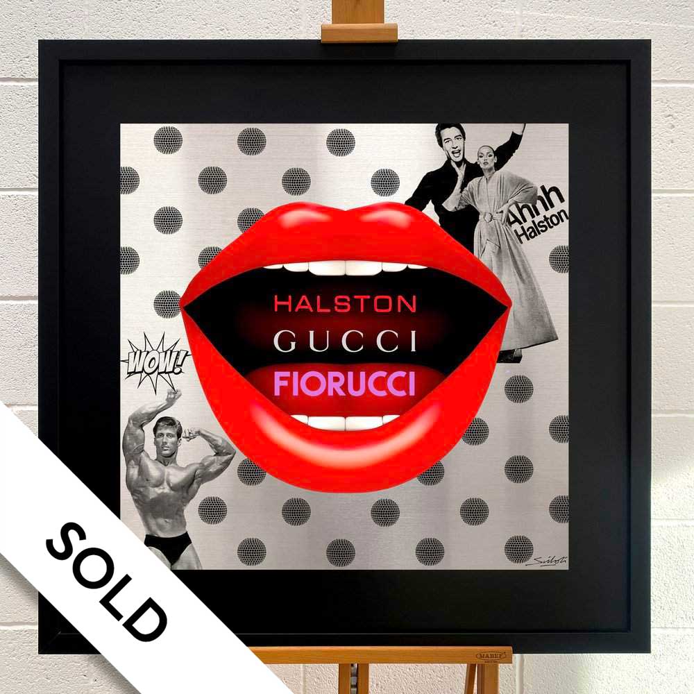 Dominating the foreground, a magnanimous large pair of “Disco Lips” passionately belt out one of the record’s most iconic lines: “Halston, Gucci, Fiorucci.” The bodybuilder depicted is Mr. America of the 1970s: Frank Zane. He represents the legendary line: “He had the kind of body that would shame Adonis.”