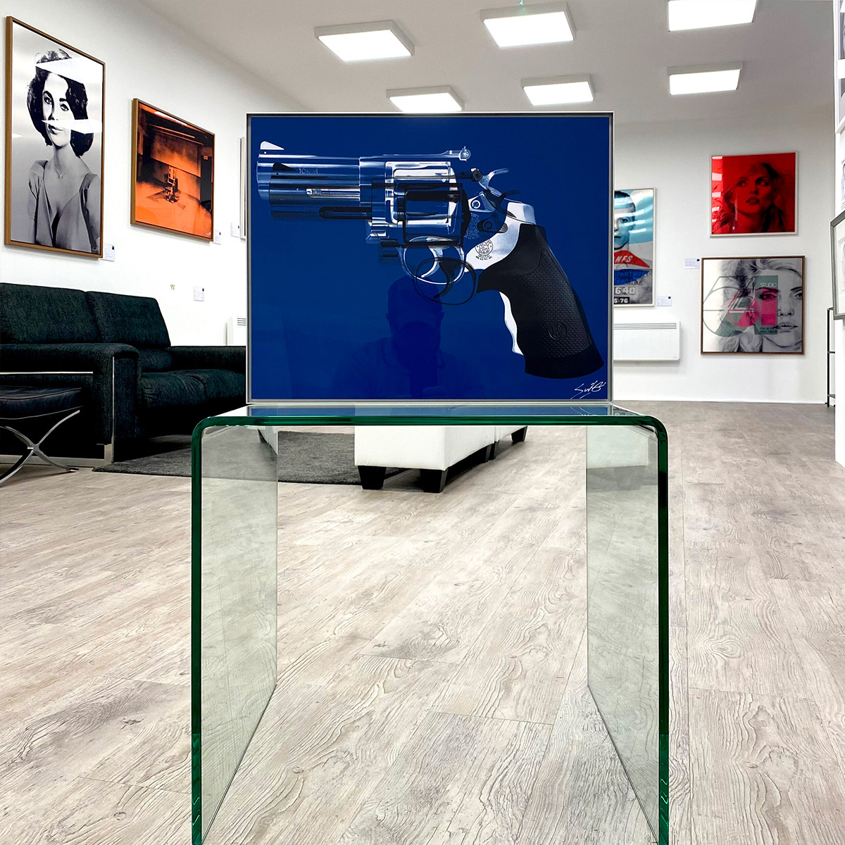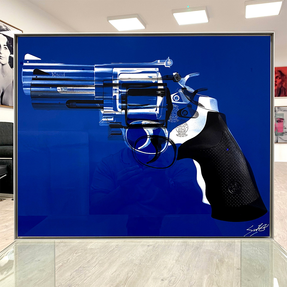 About this piece: This piece is inspired by the work of Andy Warhol, who created similar work in the 1960’s and 1970’s. It features a Smith and Weston 10mm revolver printed in a pop art style on aluminium background.