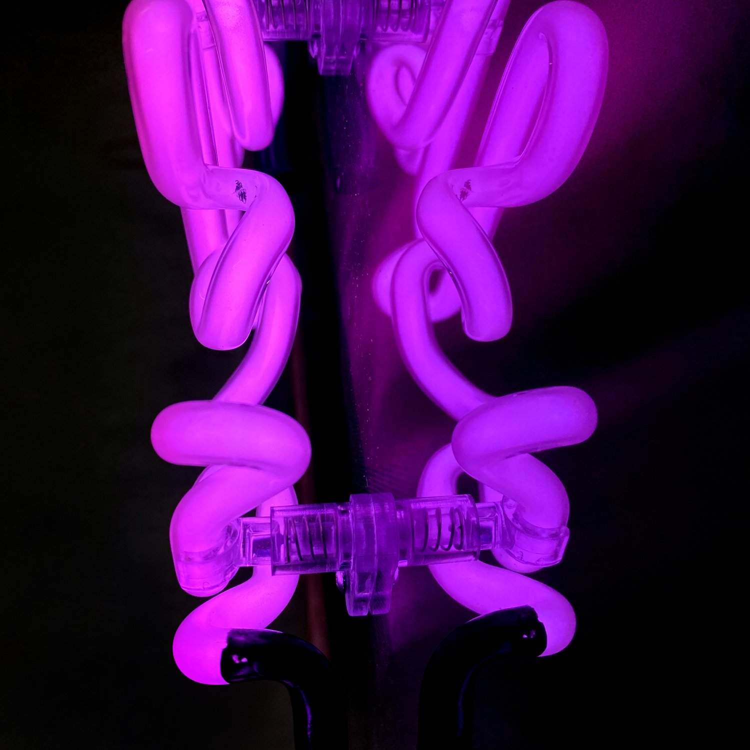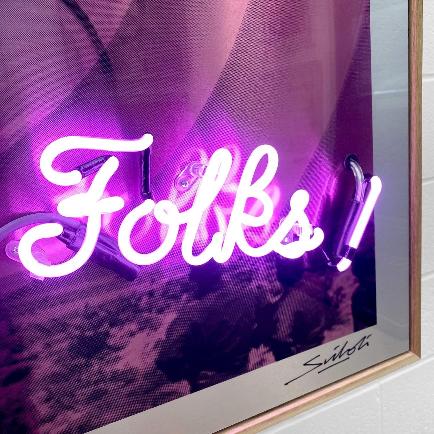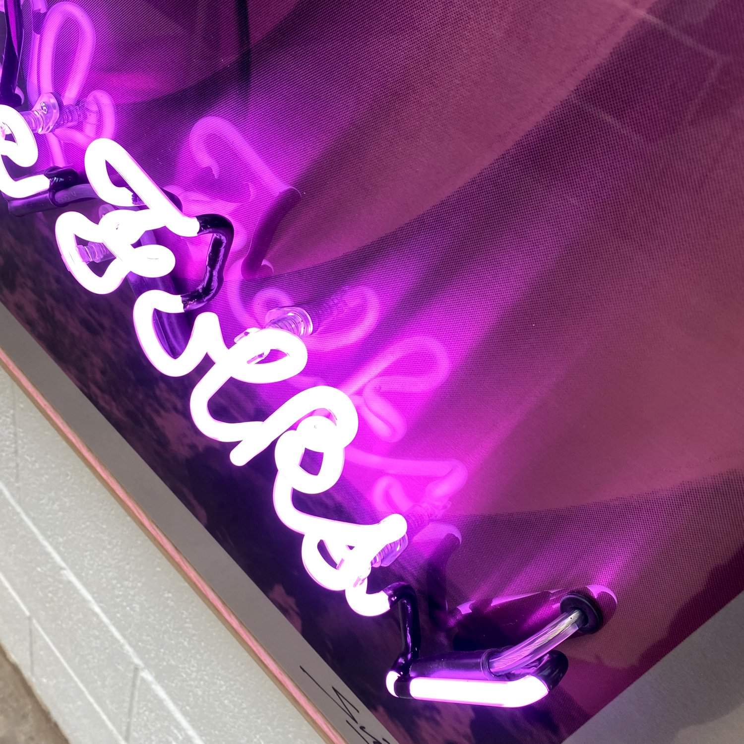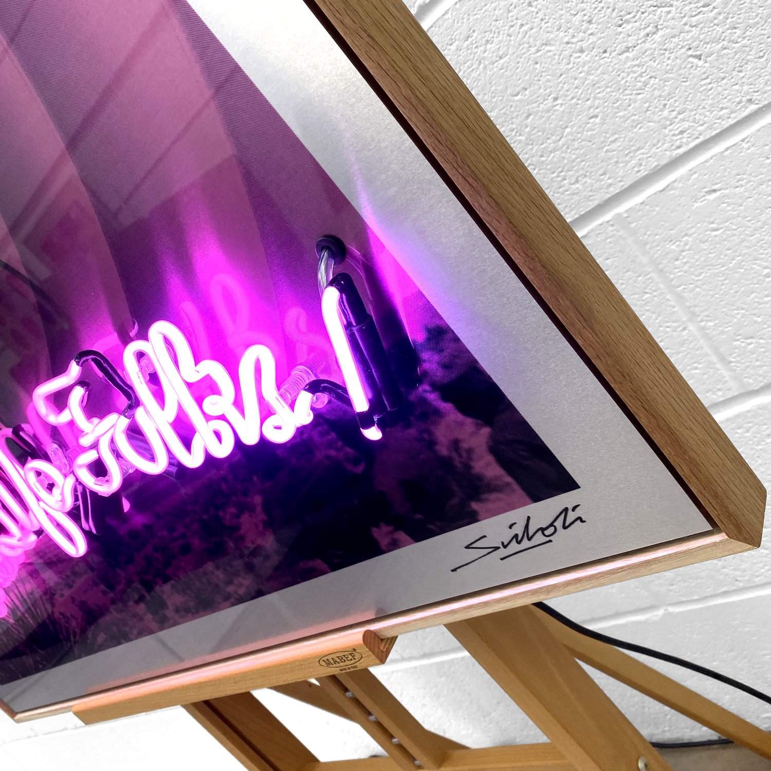Made with traditional hand crafted glass tube, vacuum filled with argon and neon gas. Mounted on high grade brushed aluminium artwork with a flawless high gloss finish and float mounted in a bespoke solid oak frame.