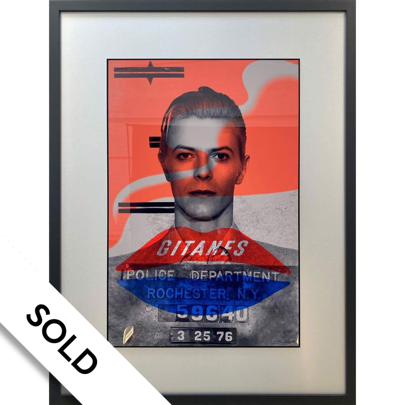 About this piece: This piece was originally inspired by the track “Rock N Roll Suicide” from the Ziggy Stardust Album of 1972. It references “Gitane” the French cigarettes that Bowie was famous for smoking in the 70’s and 80’s and depicts smoke drifting out of a pair of lips in the French tricolour. The main image is Bowie’s mugshot, taken on March the 21st, 1976, after a performance in Rochester, New York. About half a pound of marijuana was confiscated by the police.