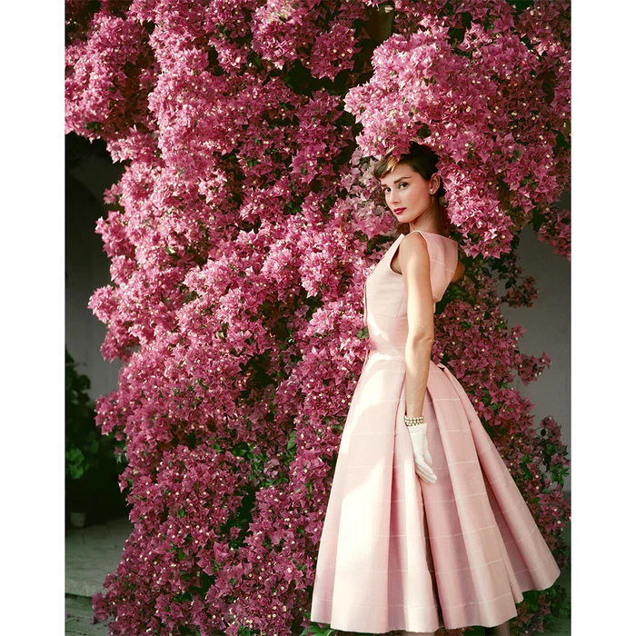 About this piece: Audrey Hepburn smiles at Villa Rolli, a farmhouse in the Alban Hills of Cecchina, Italy, during the filming of King Vidor’s War and Peace on June 23, 1955.  Photographed for Glamour magazine, the actress wears a stunning Givenchy afternoon cocktail dress from his Spring/Summer 1955 collection.
