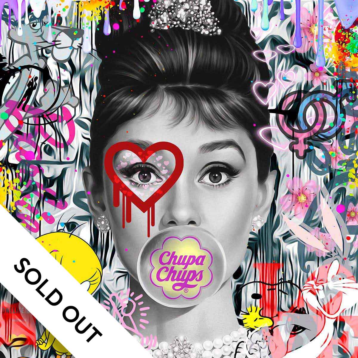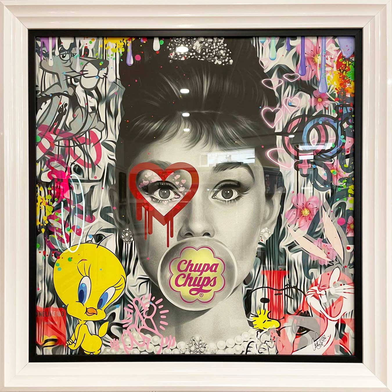 About this piece: 1993  Audrey Hepburn left this world in 1993 and she remains an Icon to this day.  Audrey Hepburn (born Audrey Kathleen Ruston; 4 May 1929 – 20 January 1993) was a British  actress and humanitarian. Recognised as both a film and fashion icon and was ranked one of the world greatest screen legends. 1993 Audrey Hepburn by #Onelife183 is a hand embellished, limited edition, canvas on board artwork of film & fashion icon Audrey Hepburn. Comes in a white frame. #OneLife183 is known for his distinctive pop paintings which present complex collage techniques, each piece is a dynamic creation of mash up pop culture which aim to critique the banal and the mundane. His artwork challenges mainstream media values and inspires a sense of freedom in life.