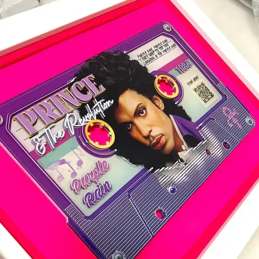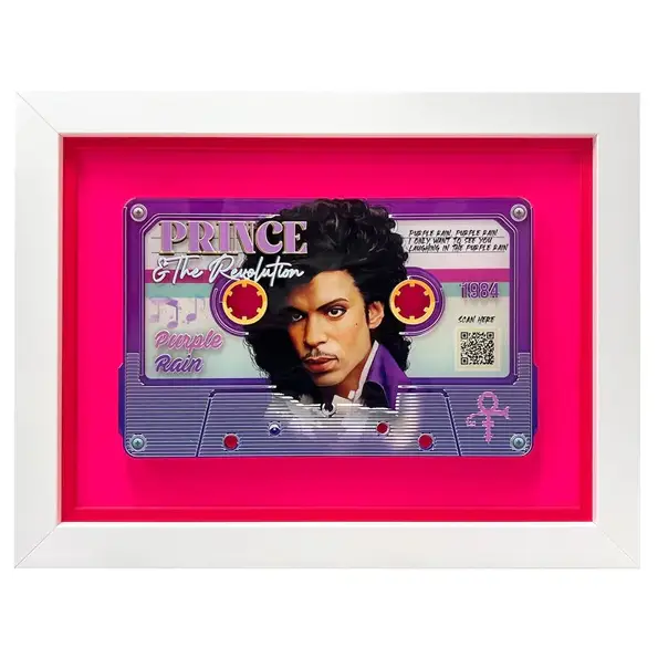 About this piece: Prince Cassette Tape – Purple Rain by Sannib. Acrylic Panel + 3D Textures and Gloss Varnish. Signed & Numbered.