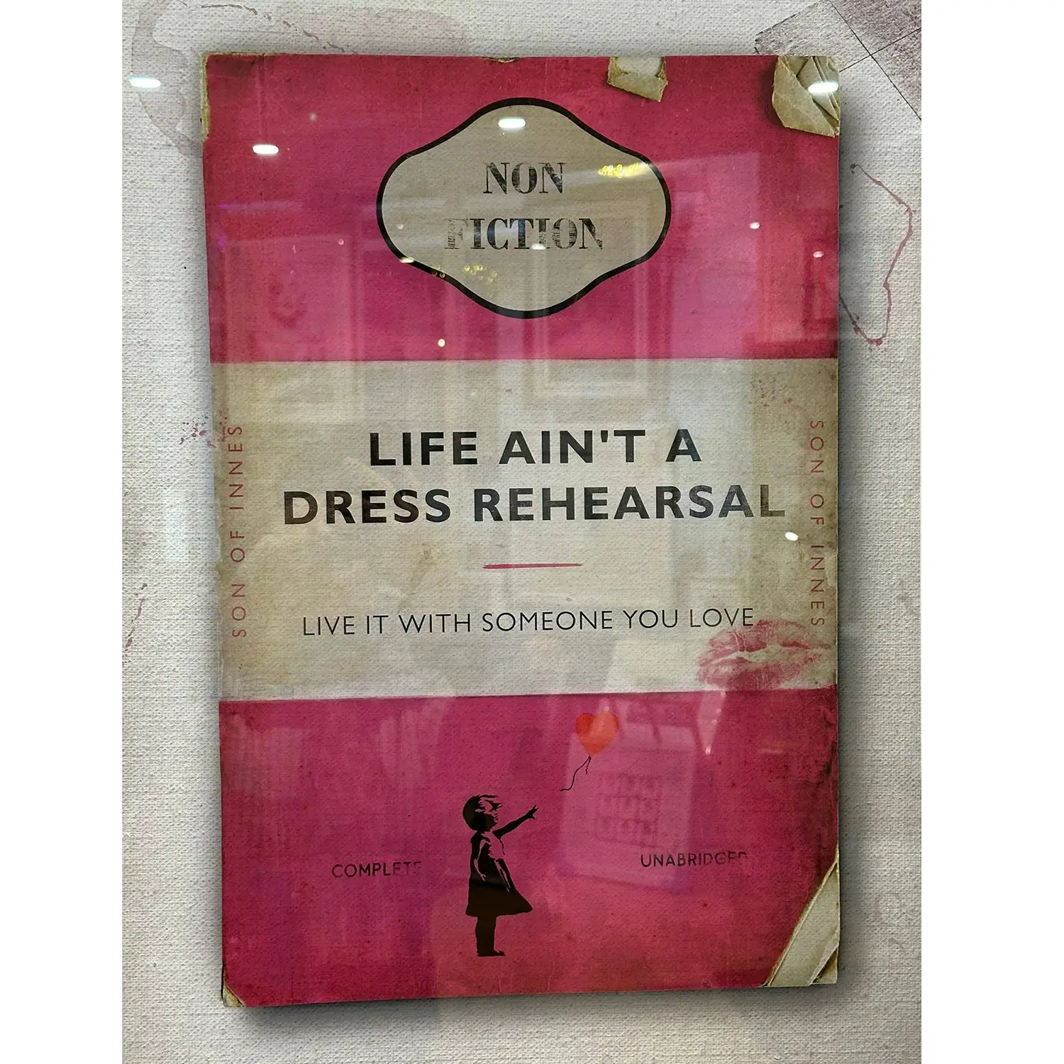 About this piece: Life Ain’t a Dress Rehearsal by Son of Innes. Floated in box frame.