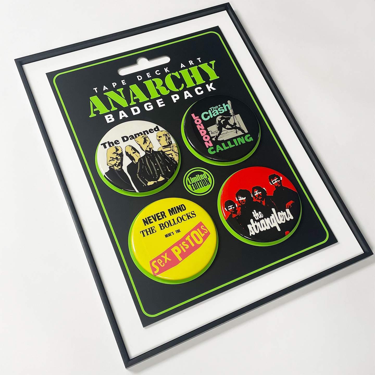 This artwork showcases oversized pin badges of legendary music icons, The Damned, The Clash, The Stranglers and Sex Pistols, meticulously hand-painted by Tony Dennis, also known as Tape Deck Art. Dennis employs acrylic paints and stencils for parts of the design. The mixed media composition includes vinyl, epoxy resin, and powder-coated aluminum, all mounted on black matte perspex. Each of the four oversized badges (20 cm in diameter) is handcrafted and assembled in the UK, complete with UV protection.