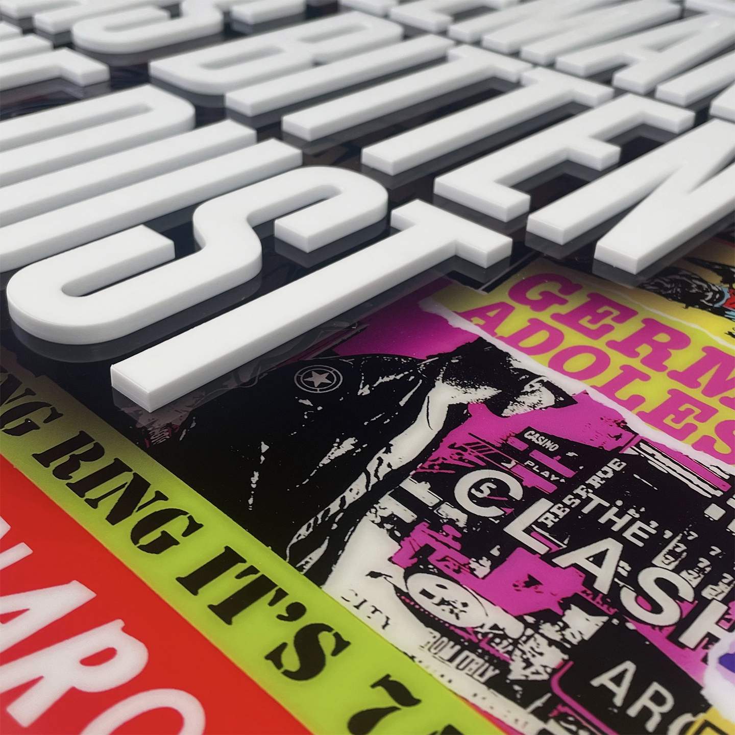 About this piece: The Clash, London Calling. Mixed media with 3D lettering (White matt Perspex 5mm in depth).