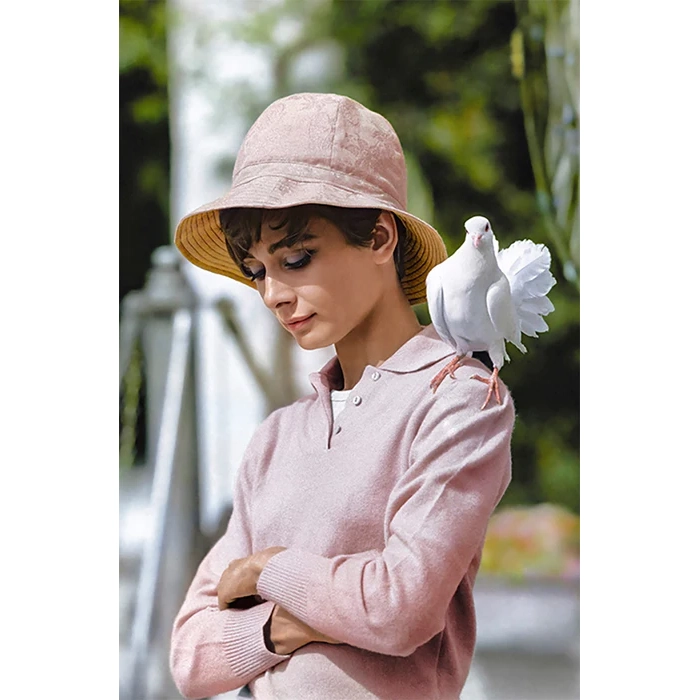 About this piece: A contemplative Audrey Hepburn with a dove perched on her shoulder on the set of ‘Two for the Road’ in France, 1966.