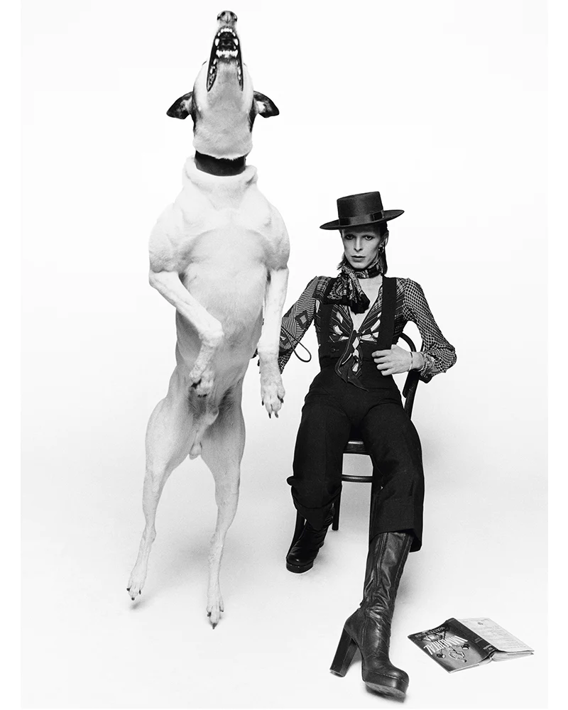 About this piece: Singer David Bowie poses with a large barking dog for publicity shots for his 1974 album Diamond Dogs in London. Conceived during a period of uncertainty over where his career was headed, Diamond Dogs is the result of multiple projects Bowie envisioned at the time, which is reflected in the photoshoot’s quirky fashion.